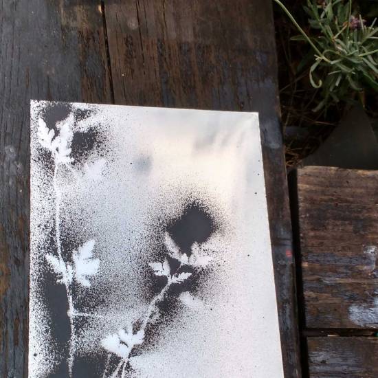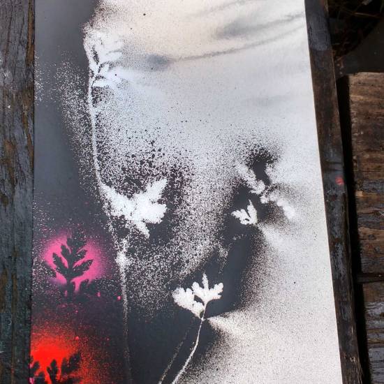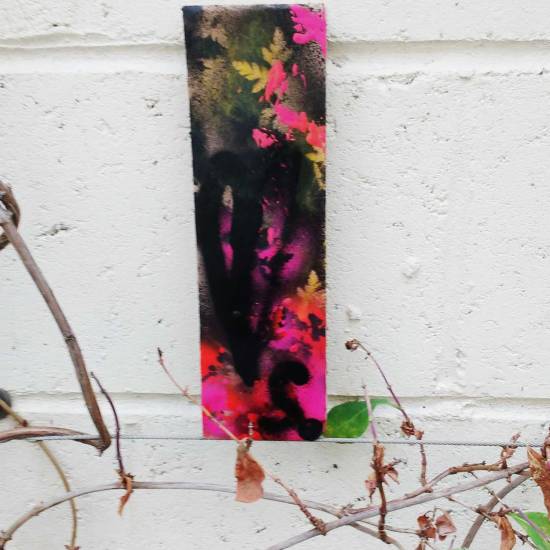 183/365 – Fresh Leaf Growth, July 2nd Fresh growth, new layers, leaves and the ongoing notion of a smaller painting brought to a completed conclusion on every single day of 2017. On day 183, a 183rd piece, spray paint, varnish on a found piece of mirrored reflected cardboard