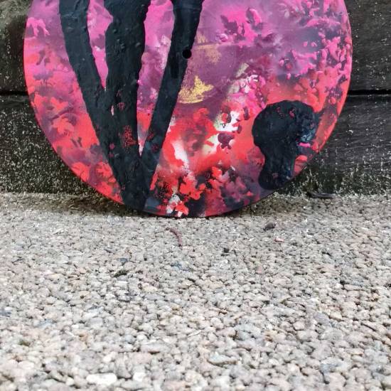 176/365 – Fresh Leaf Growth, June 25th Fresh growth, new layers, leaves and the ongoing notion of a smaller painting brought to a completed conclusion on every single day of 2017. On day 176, a 176th piece, spray paint, varnish on a found 78 shellac record