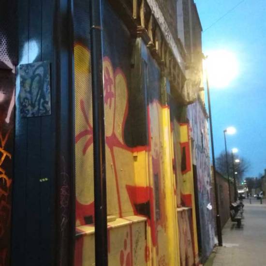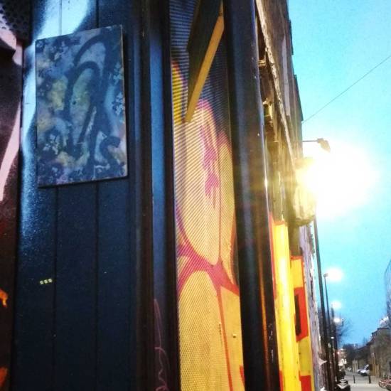 A leaf – #365ArtDrop18 2/365 – A leaf left hanging, the second of 365 artdrop pieces of 2018, one of the daily concluded paintings of 2017 painted on a piece of found recycled hardboard and now left out by a door in Hoxton, East London left there for someone to take should they wish to do so