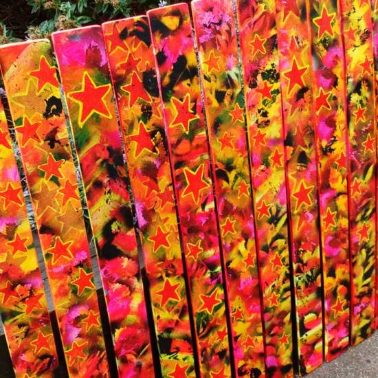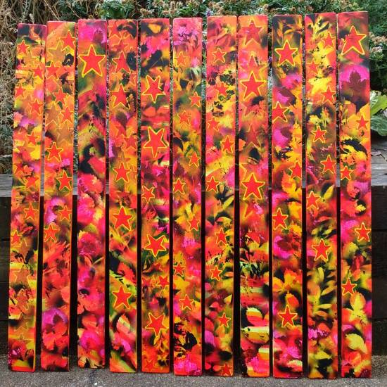 I’m kicking myself for not taking a photograph of the broken bed base as it was when I cane upon it on the street in Hackney, the wooden bed had been smashed up and dumped on the street, I couldn’t resist the wooden struts that were left lying there unbroken on the pavement (other bits of wood from the smashed up bed have become artdrop pieces). Really am kicking myself for not taking a photo of the wreckage on Mare Street, it was one of those days when I head out from the studio in search of something to paint on, my rule is that I can’t come back home until I’ve found something, should have taken a photo of the pieces of wooden bed on the street, I have taken lots of photos of the painting process. The eleven pieces were cleaned up, sanded down and all eleven were painted together, there weren’t painted to fit together, they were all painted at the same time, painted together, all started and finished together, several layers grown on each one over a period of around three weeks…