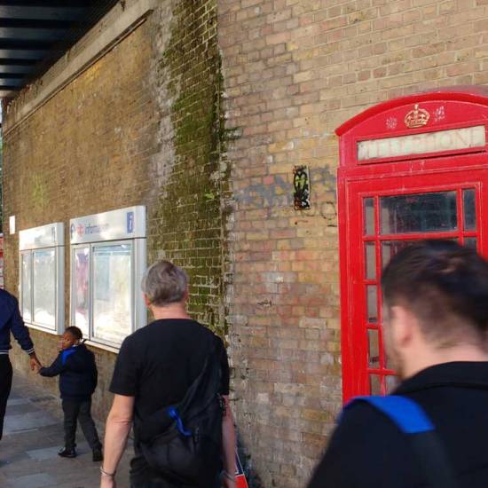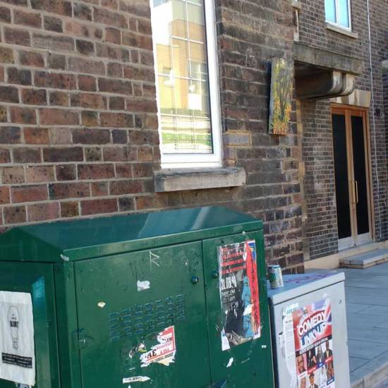 We don’t hang around after the pieces have been hung, just leave them, take some photos asa record and then quietly go, we could see as we retraced our steps that some pieces had been taken straight away, indeed one piece almost as we were hanging it (great conversation about Deptford and art and people with this guy who came over and asked about what we were doing (as I keep saying, a big part of what this piece is about is engagement)/ Others pieces were still there when we left, there to be claimed later as we saw via postings from people who had found pieces and posted images on their social media feeds in the days after the drop – there is the #365ArtDrop18 hashtag on the back of each piece, engagement and people posting photos is a big part of the piece, it is encouraged…