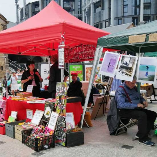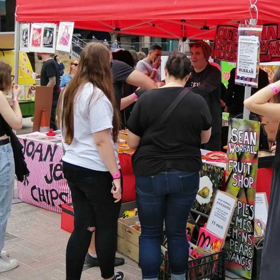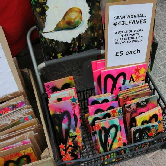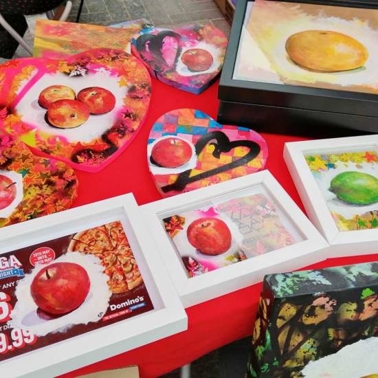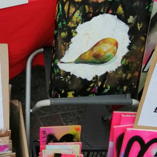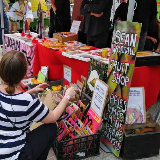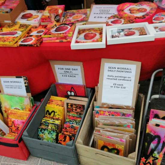 The Fruit Shop is my thing, the Fruit Shop will make another appearance at this year’s Whitecross Street Party on Saturday and Sunday13th/14th July on Whitecross Street, London EC1 – The Fruit Shop will make a third appearance of the year at the 10th annual Whitecross Street Party during the day (Midday until 6pm), and like it did at the Art Car Boot Fair the Fruit shop will take the from of a market stall. The day and the whole street should be alive with art, with a big cast of street artists, with stalls, food, with live painting, music, art is the galleries and more. The Fruit Shop will be alive with fresh apples, oranges and who knows what. it will mostly be a Sean Worrall thing, affordable original paintings in line with the Cheap Art Manifesto/ We will have the option of Emma Harvey’s Chips or Joan Jett along with a number of other pieces of art from guest artists on the Fruit Shop stall over the weekend. Entry to the event is free in terms of attendance