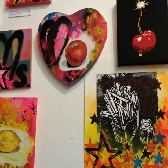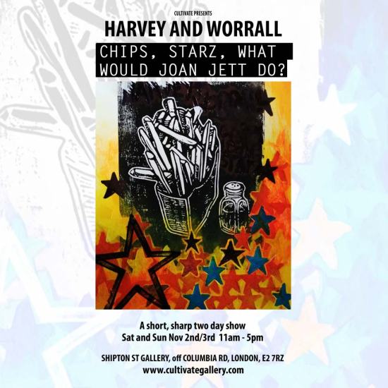 Anyway, never mind the dogs or the squares or that Stefdies swore for the very first time, we’re half way through another of our Month-long Cultivate Columbia Road take overs, the third time we’ve done it at that Shipton Street space now. This the whole takeover thing kicked off at the start of the month with a short sharp two day weekend show, a kind of installation thing, and yes, you guessed it, more damn blowing of our own damn trumpets – a show led by Emma Harvey and her on-going questions about Joan Jett, about Joan Jett or chips? About what Joan Jett might do about any of it? Another Harvey and Worrall show, a kind of follow up to that time and that show in that East London Edwardian dressmaker’s shop a couple of years ago, that and this year’s Art Car Boot Fair adventures from Emma – a two day show called Chips, Starz, What Would Joan Jett do? Just a two day show, no opening night, partly out of respect for and consideration of the Atom Gallery Can I get A Slice show that opened the evening of November 1st, no way did we want to distract from that one – a fund raising benefit event for the Hackney Foodbank feature something like fifty invited artists all painting or printing on or in pizza boxes, we didn’t want people coming to our show rather than heading over to North London for that one (and anyway we both had work in the pizza box show), and anyway, why does there always need to be an “opening”? We put up the work on the Friday, we went off for a pizza at Atom Gallery, then we opened on the Saturday morning and we closed it all on the Sunday evening – bang, rocking at least six times, a short sharp two day art show over one weekend down by the Columbia Road flower market.