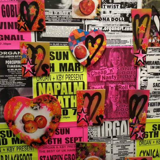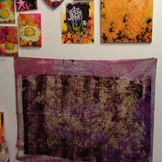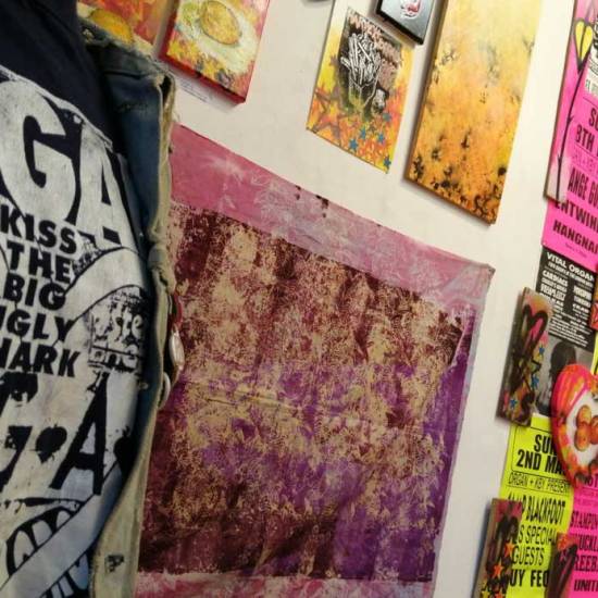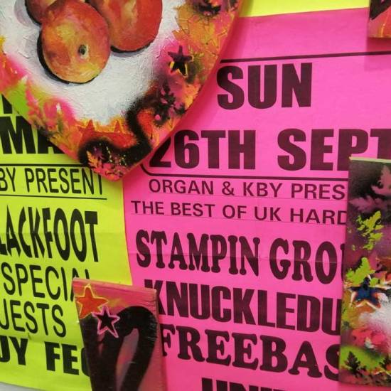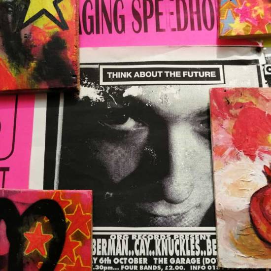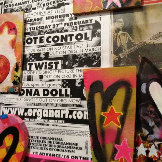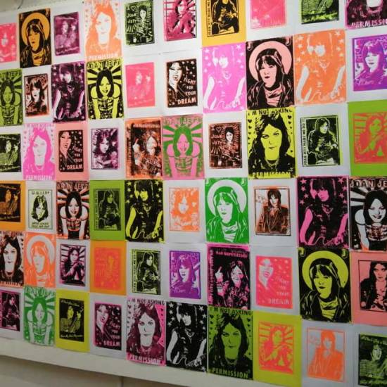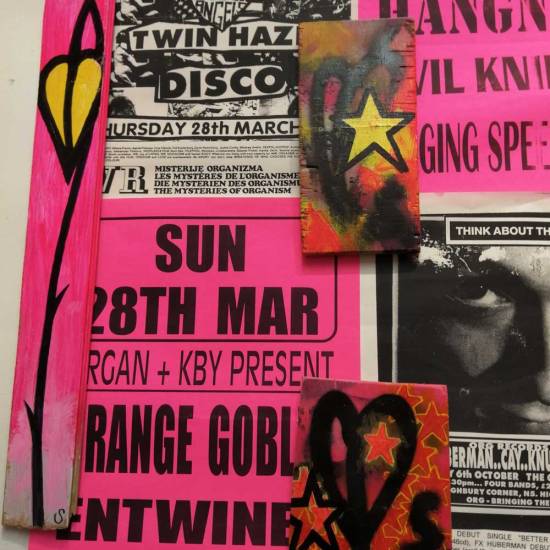 A two person show yes, but a show that really was all about Emma Harvey and her big wall of Joans – there wasn’t a print release, none of them were on sale, it was one piece of art, 96 very (very) bright handmade punk rock lino prints alive with dayglo attitude, what would Joan Jett do? No one’s permission was needed, no one’s reputation was cared for. Sure, there were two artists sharing the space, I was the other one, but it really was all about that head-to-foot wall of glorious Joan Jett riot-grrrl-fuelled dayglo intensity. The wall looked brilliant, it was exciting, people reacted, “Oh I loved Joan Jett”, “who is Joan Jett?”, “we must go home and ask Alexa to play some Joan Jett”, the council Roadsweeper went past singing “I Love Rock ‘n Roll” very loudly, people came down to have their photos taken in front of it all, I knew it was going to be dayglo-bright, the photos go nowhere near capturing how bright it actually was, 96 Joan Jetts on the wall and a couple of Joan Jett tapestry pieces as well, I loved it, they loved it, I’m pretty surer Joan would love it, Yes, it started off as a two person show but it really was all about Emma (and Joan) this time/ I kind of knew what she was going to do so I reacted with some old gig posters from my days when I was silly enough to put gigs on as well as run a record label and sit in the back of transit vans touring the land and such,, old dayglo gig posters full of ancient history, that and one last Organ t-shirt left from the end of the last century – there’s been a whole roll of old gig posters up on a shelf in the corner of the studio for years, forgotten about half of those gigs – oh and an old piece of art from way way back, an old textile piece, a resist print from a screen print and a leafy line-drawing (no it wasn’t Batik!) See, it was always about leaves (check some of those old record sleeves, they’ve all got leaves Growing on them). Anyway, a two day show, a whole load of old Organ history dusted off for one last time and a whole load of recent paintings on found recycled pieces of wood picked up off the street or out of skips all hung in response to the wall of punk rock on Emma’s side of the gallery. It really was all about that wall of Joans though, that wall looked brilliant and I don’t care what you think about me saying so (sw)