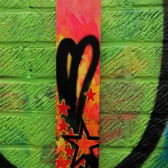 Recycling, waste, things people just throw away, over the last decade I would estimate there been over 2000 art drop pieces as well as bigger gallery pieces all pained on found unwanted, thrown out recycled material I;ve found and taken back to my studio. Big canvases, old paintings, doors, old vinyl records, frames, guitars and other musical instruments, skateboard decks, packaging, wood, so much wood just pulled out of skips and bins. Most of my big paintings are on canvases that has been found in skips outside galleries or studios, fresh layers of growth over other people’s paintings that were heading for landfill, sometimes they need a bit of stitching or repairing, often they need a lot of cleaning, I’m currently painting on a piece of broken furniture for a show that opens next Thursday evening at Stash gallery, a fund raising benefit show called “Punk for Mental Health”. The artdrop pieces left on the street for people to just take are generally tagged with a hashtag as #artdrop pieces, or more recently as #43Leaves pieces so that people can use the hashtag, interact and find out more if they’ve chosen to take a piece. Over the last ten years pieces, mostly left around London, have found homes all over the globe, and yes I’m sure some of them do end up in landfill but really that’s where the material painted on was heading anyway. Incidentally someone complained recently about me putting nails in walls, the pieces are always hung on nails or screws that are already there (if you catch me looking strangely at a wall, I’m looking for old nails that might be there so I can hang paintings on), the pieces are always intended for people to just take should they wish to.