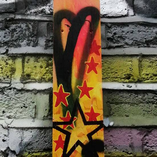 There’s so much waste, mindless waste, why? Why was I able to pull out these perfectly good pieces of wood out of a bin a couple of weeks ago? Along with a perfectly good fully working electric guitar I might add! Even the strings were on it, I haven’t painted on the guitar, it is now being used by a musician rather pleased to receive it Take these things to the charity shop, leave them on a the pavement with a “please take” notice on them, set recycle bins for things like your wood so others can make use of it, I almost don’t want to mention the Extinction Rebellion flag I pulled out of a bin in Hackney recently! Come on people, walk it rather then just talk it, the (mostly young) people who live in the flats in the block above my studio seem to wear their clothing for a week or tow and then just throw it out (and not even in to a recycling bin) without a second’s thought.. Actually I’m typing this on a computer pulled out of a skip a few years back,nothing wrong with it (once we’d leaned off all the personal stuff the people who binned it had left on it). Part of this is out of necessity, most of it is artistic statement though, it is a deliberate artistic act and surely a big part of it is just common sense, yes it might all be a tiny drop in the ocean but maybe if well all added a small drop it maybe might not be too late?