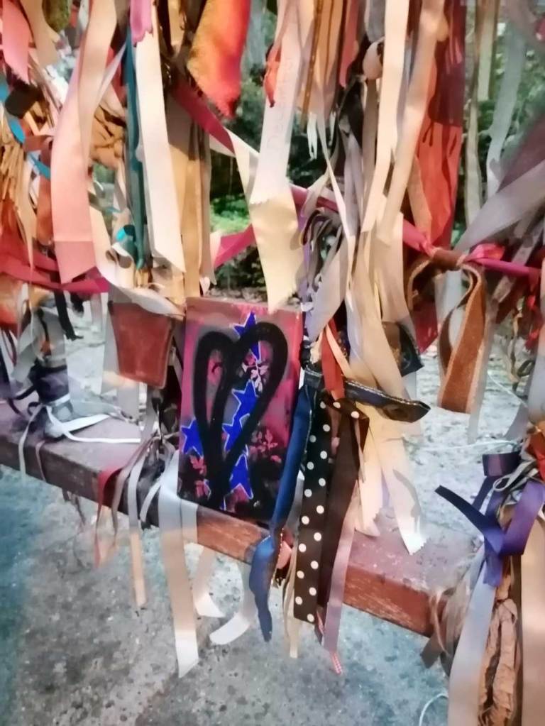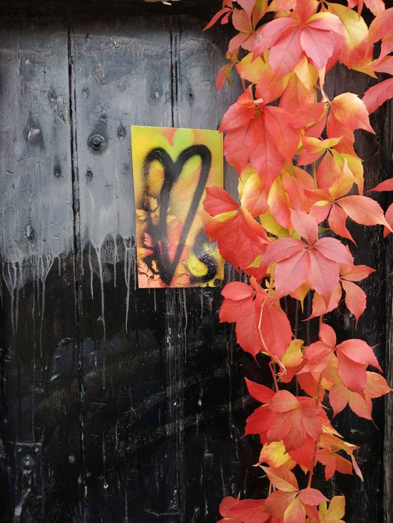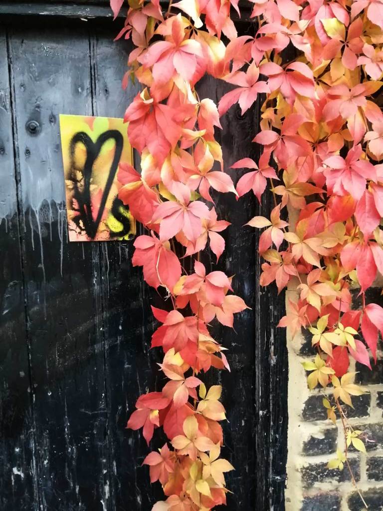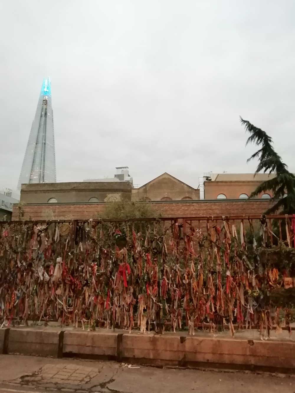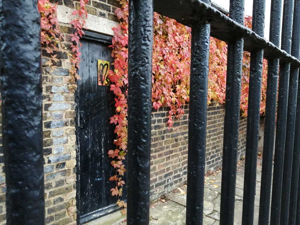 A leaf left hanging on the Crossbones fence, South London, October 2020