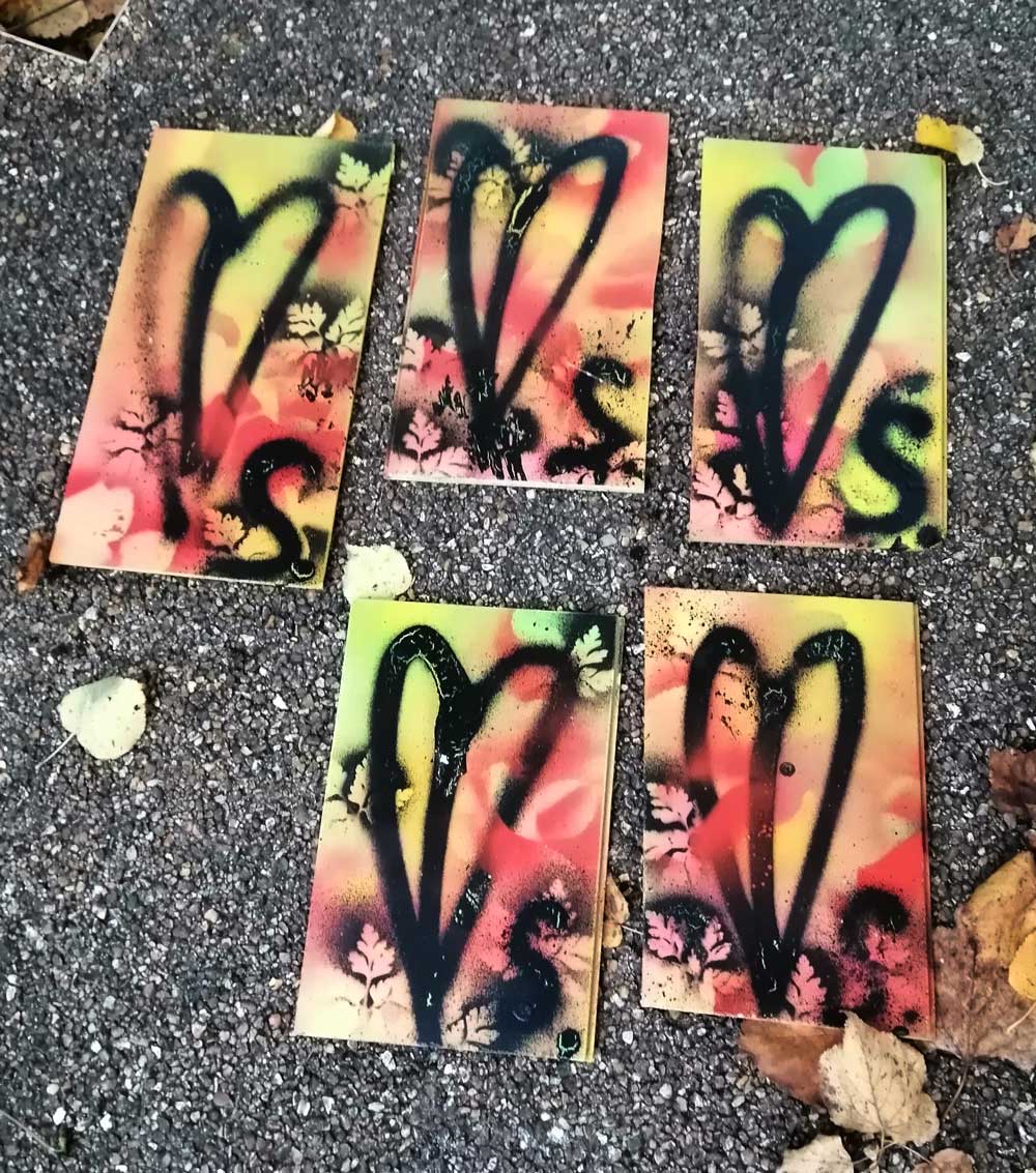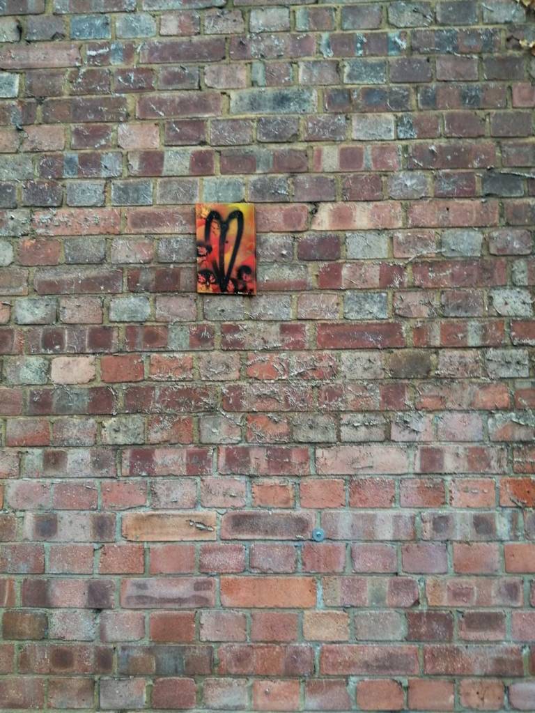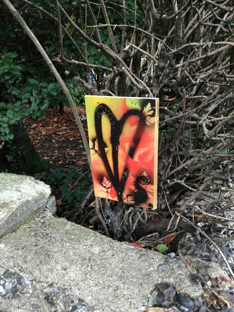 There has been a number of leaves left in the last week, fresh leaves painted on found recycled wood picked up off the street, wood picked up, cleaned up and painted on before being left out there. Fresh art drops there for people to just take should they wish to. I suspect there has been something like 2000 paintings on found unwanted recycled material now, 2000 paintings just left out there for people to take, 2000 [ieces of unwanted wood and such pulled from skips and recycled. Last weekend it was mostly down by the river, leaves left down by the Thames.