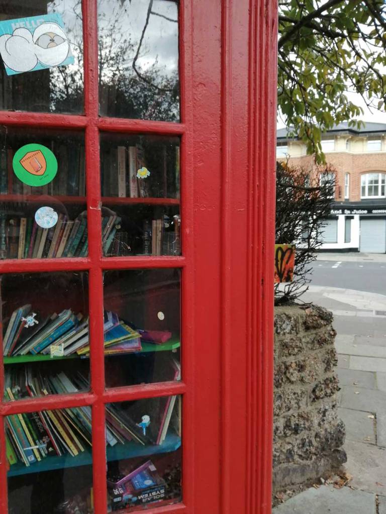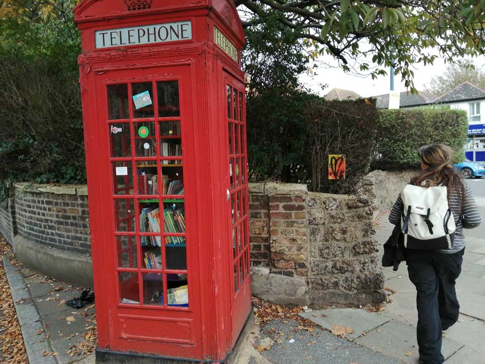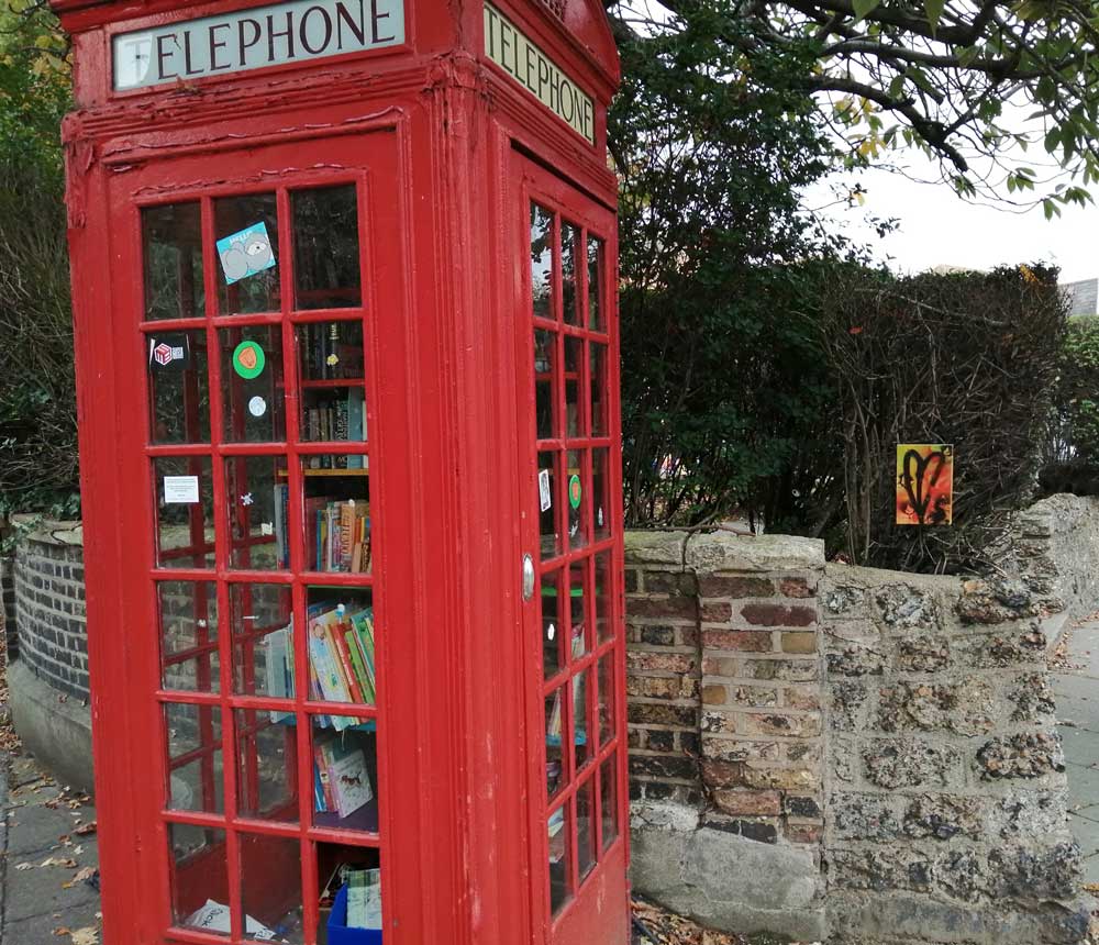 A leaf left hanging by an olf phonebox, London SE8, October 2020