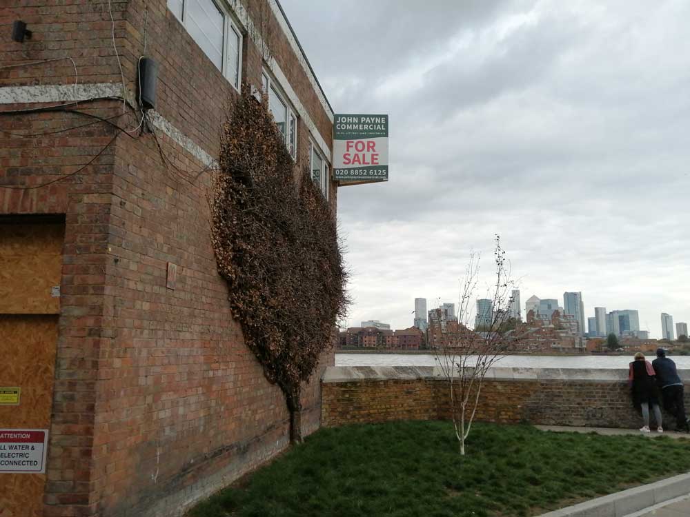 A leaf left hanging by The Rover Thames, Greenwich, London SE8, October 2020