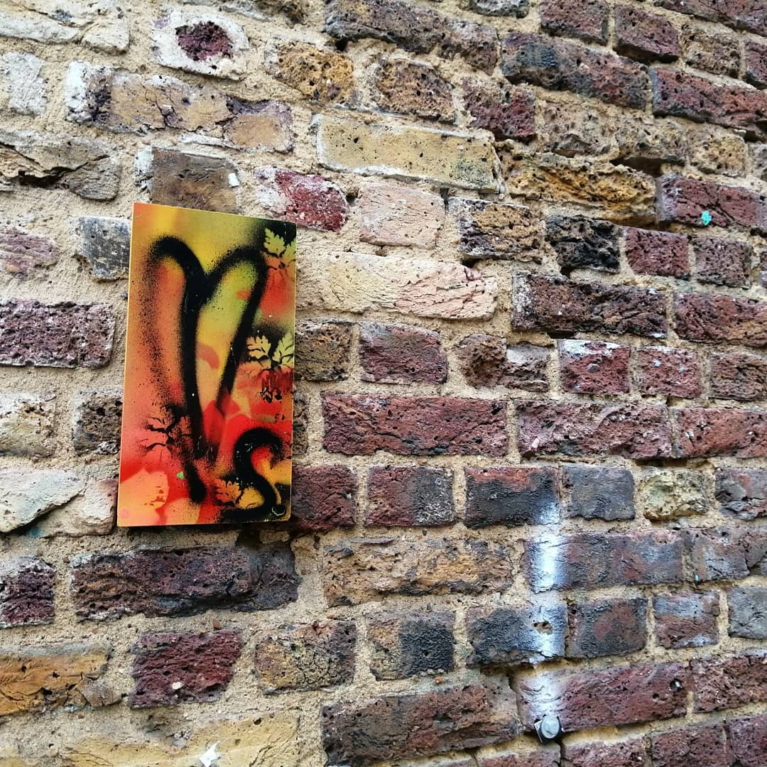 Another leaf left hanging, they are still regularly left, sometimes without a mention. A left painted on something found, something thrown out and probably heading for landfill,in this case a piece of wooden flooring pick out of a Hackney skip. material found, picked up, cleaned up, painted on and them left hanging out on the street for someone to just take, no big fan fair, no print release to go with it, nothing on sale in a gallery around the corner, no publicity stunt, just a piece of art, street art if you wish, a piece of art just left there for someone to take. I am picky about where I put them, this one was left under the curve of the railway that was recently revealed by the clearing of a building in front of one of the arches. This painting was left last Sunday, I don’t know what happened to it, I quite often don’t get to find out, it it good when we do hear something, did it end up in landfill anyway? Is it on someone’s wall? Did someone take it and give it to someone else? Who knows?