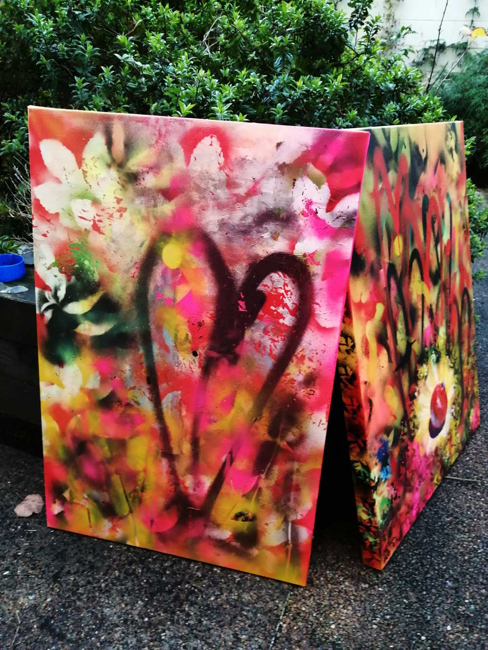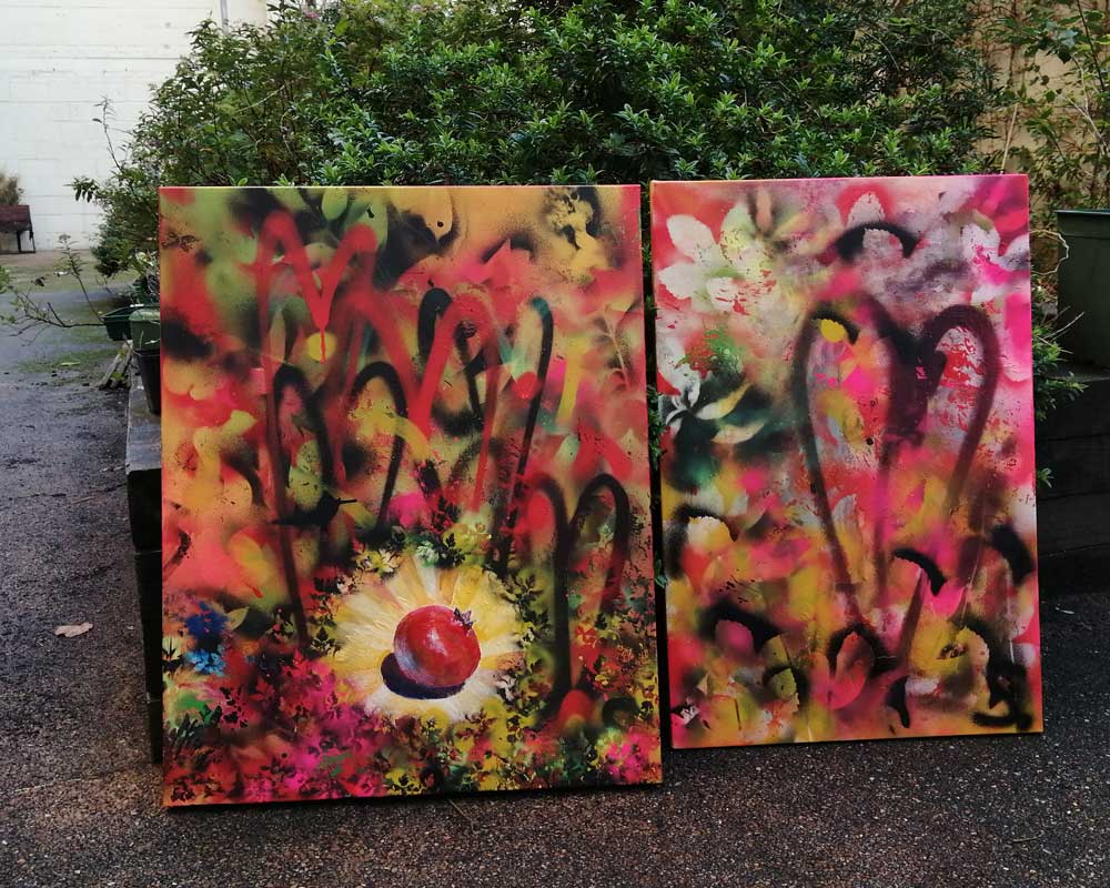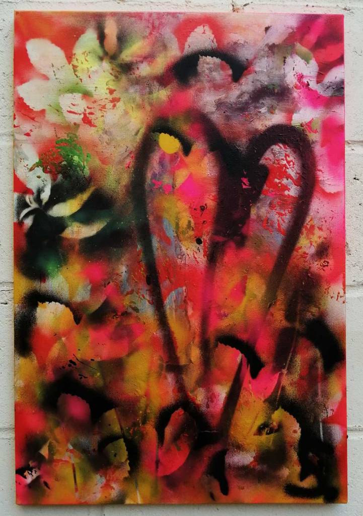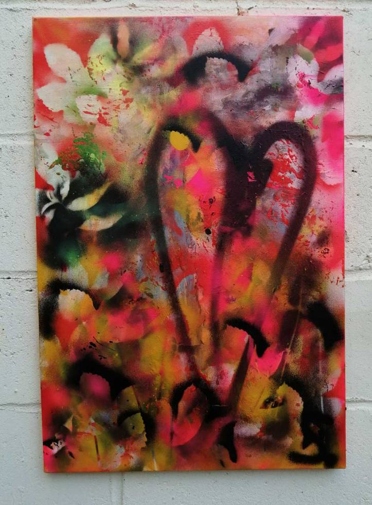 “Garden over it” (November 2020) – Acrylic, spray paint on found canvas, 70cm x 50cm