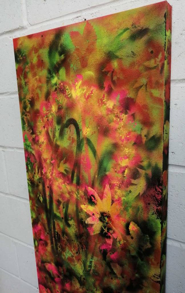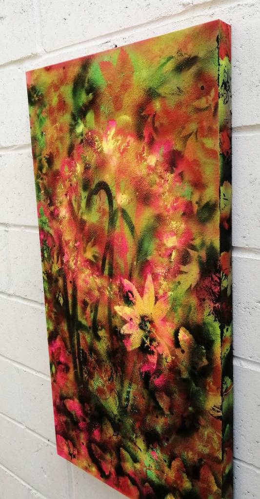 “Wearing Feelings On Our Faces (A Flower?) – Acrylic on wood, 54cm x 120cm x 5cm – A new painting concluded, a slightly larger piece painted on a found wooden “canvas” that once has a dubious print stuck to it and had found itself in thrown out in a Hackney skip. And when something is thrown out then leaves will grow on it… A Flower, maybe?