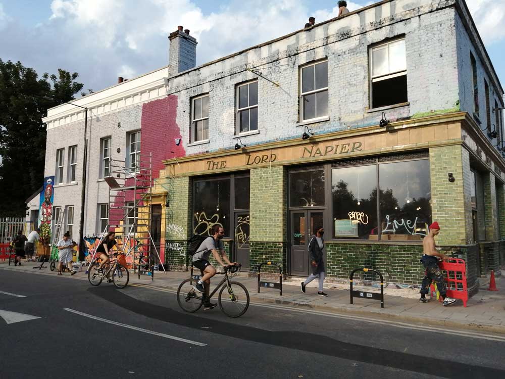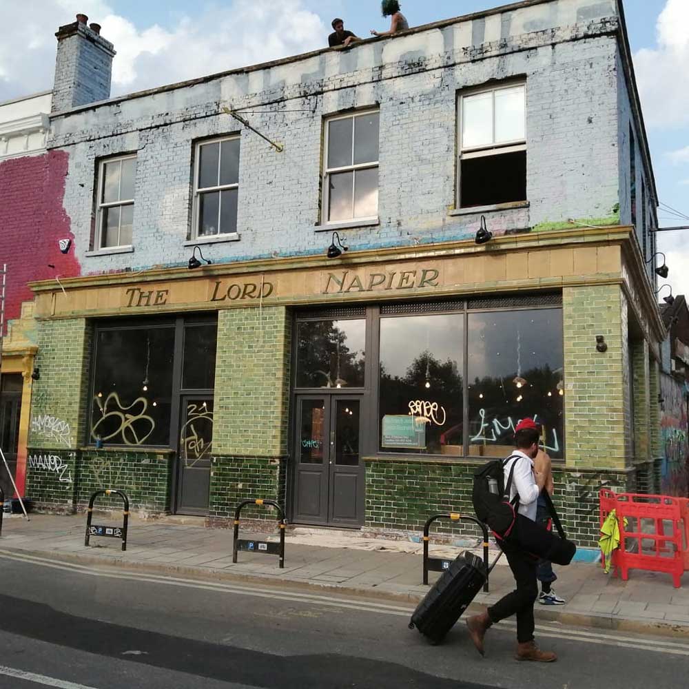 Last week a leaf, one of 43 paintings that make up the latest #43Leaves piece, was left hanging by the Lord Napier over in Hackney Wick and there they were painting off the bit about the penthouse… End of another era. Kind of sad to see the Penthouse bit going, I should write a piece about it for Organ . First time I encountered the Lord Napier was on the way to a Motorhead gig at Hackney Speedway track, a rather eventful all day open air gig policed by the Hells Angels, that was way way back in another lifetime, a previous century. I’ve left leaves on the old derelict pub on many occasions over the last dozen or so years, went there to do it one more time before the pub reopened, and decided in the end not to do so, instead I opted for a leaf left hanging on the wall over the road. 14 more to go before the piece is concluded…