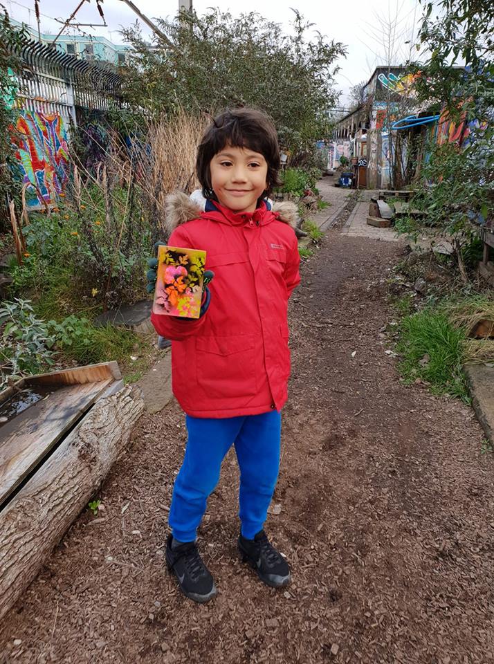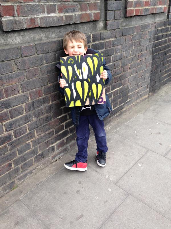 Another leaf found, one of the #43Leaves pieces left hanging in Deptford as part of this year’s Deptford X. Matt just sent in this photo with the piece he found. One of 43 paintings that make up the latest #43Leaves piece, 43 paintings on found unwanted #recycled material. Material picked up off the street, cleaned up, painted on and then left hanging back out on the streets for people to just take should they wish to. Big big thanks to Matt for taking the time to send the photo in, this is what it is all about, engagement.