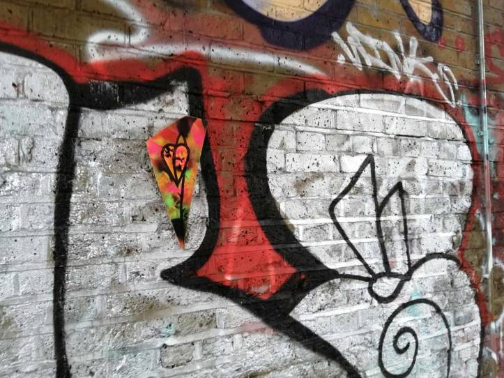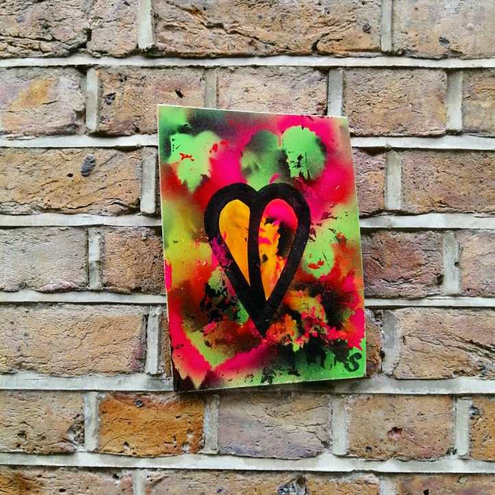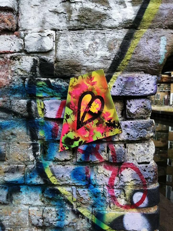 This Summer’s #43Leaves piece that started at Deptford X, went on throughout August. 43 paintings on found unwanted recycled material, material found, cleaned up, painted on and then just left hanging back out there on the streets or under railways bridges or by the canal for people to just take should they wish to.