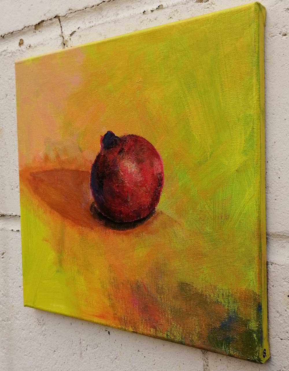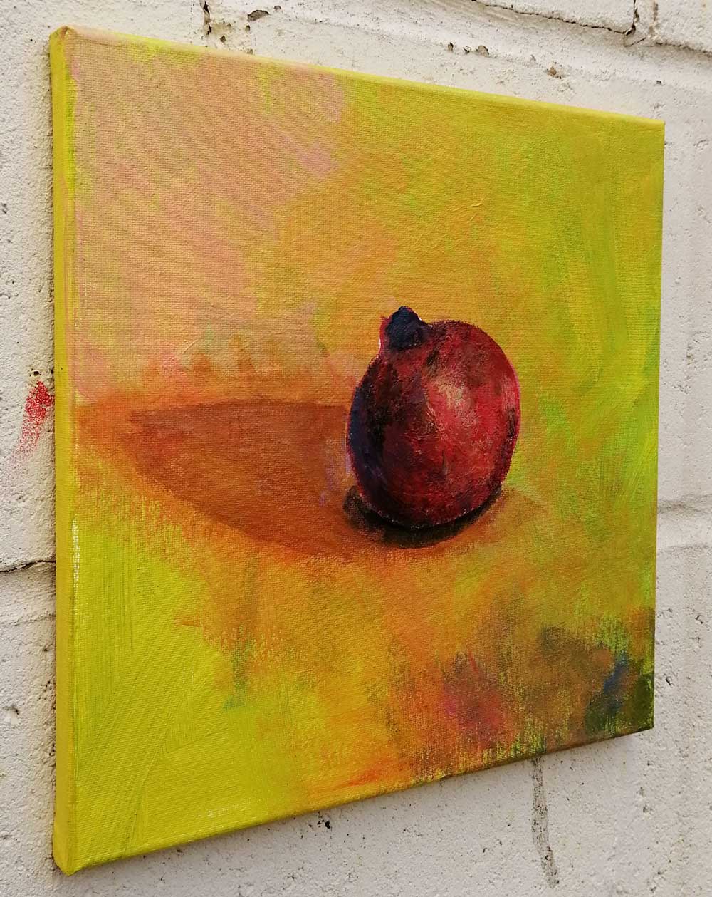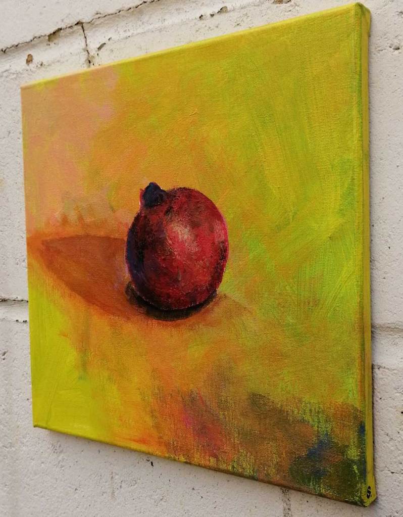 “A Pomegranate From Whitechapel Market” – Acrylic on canvas, 30cm x 30cm x 1cm – a new painting concluded this morning, another of the Fruitshop paintings, Find it today at this weekend’s Art Car Boot Fair