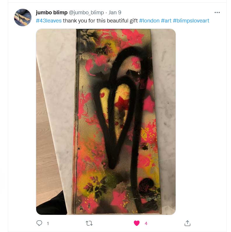 The January 2022 #43Leaves piece goes on, 18 pieces have gone out now, parts 19 and 20 are in my bag. As I said yesterday, these pieces are as much about the people who chose to take them and the places they are hung as they are about the paintings themselves – about the photos other people post on their own social media, about where the pieces go, the hashtag is part of it. And in answer to a rather irrate question, no, I don’t knock my own nails in, the pieces are only ever hung on screws or nails that are already there waiting, no damage was done, nothing was harmed and there pieces are really not meant to stay there for too long, most of the time they go within hours, and yes, I am very picky in terms of where I choose to hang them…