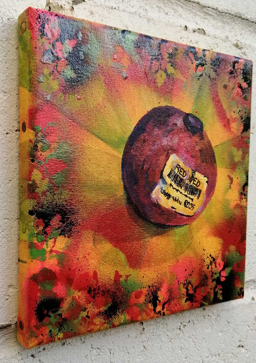 “The Reduced Price Pomegranate” (Feb 2022) – Acrylic on canvas, 20cm x 20cm x 1cm