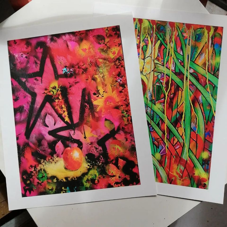 This month’s limited edition print is of a painting that had been evolcing through 2021 and was finally oncluded in December of last year. The original painting is on a found repaired stiched back together canvas, the stitching and the repair is very much part of the piece.