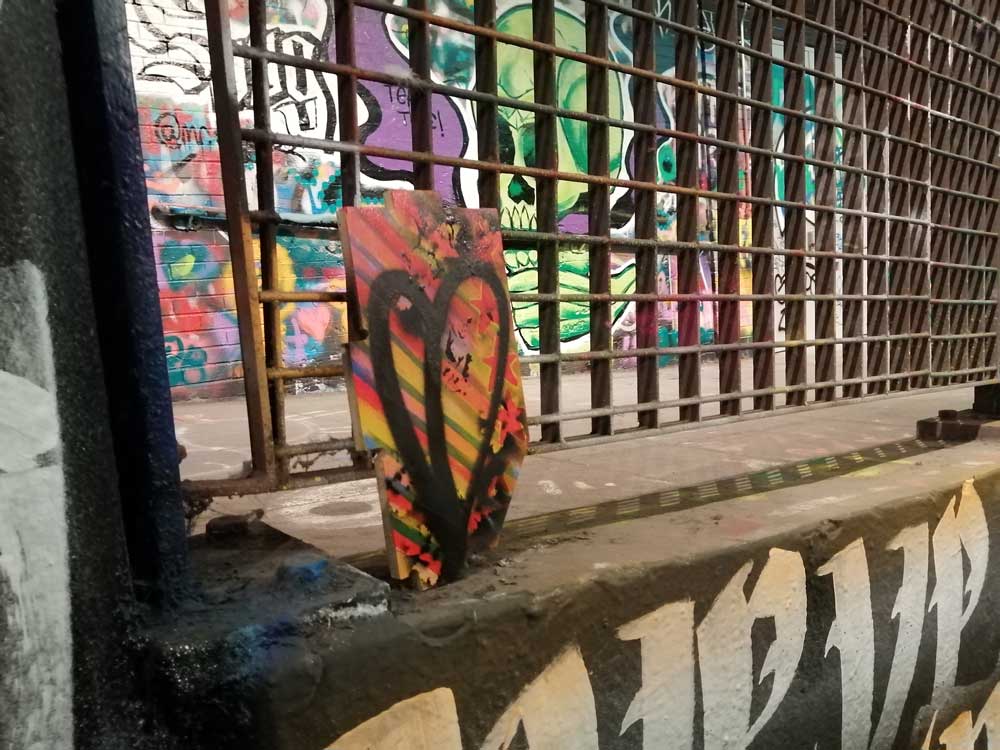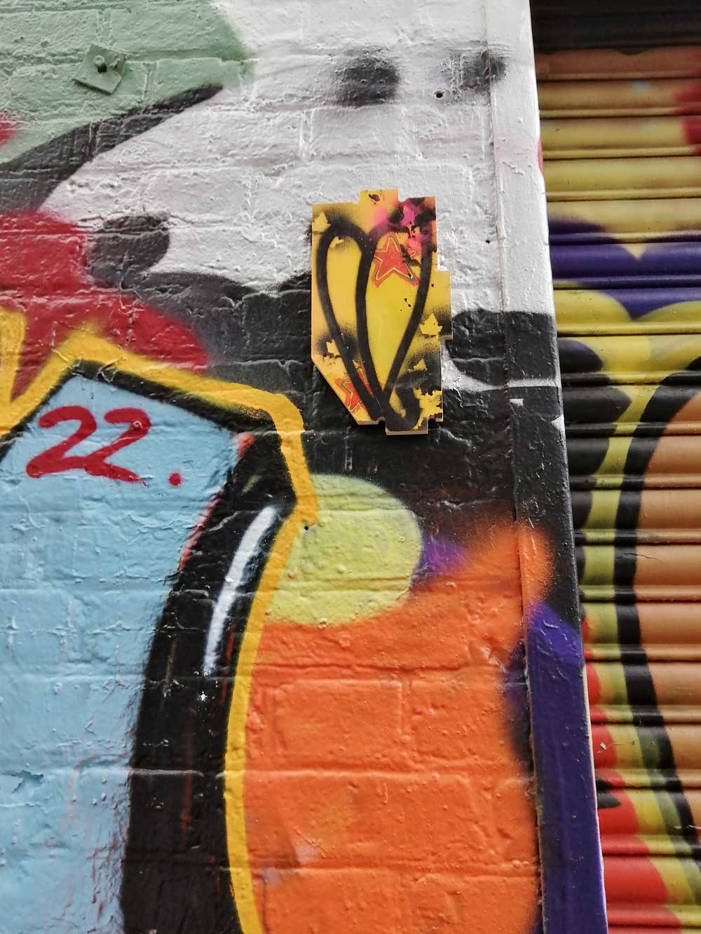 Another five of ten fresh leaves left hanging, a new #43Leaves piece for April 2022 (that kind of extended into early May), this time in ten parts. Ten leaves painted on strangely shaped pieeces of wood found on the street. Pieces of wood found on the street, cleaned up, painted on and then left hanging back out there on the street for people to just take should they wish to. This time is was down in Leake Tunnel and then back to Brick Lane…