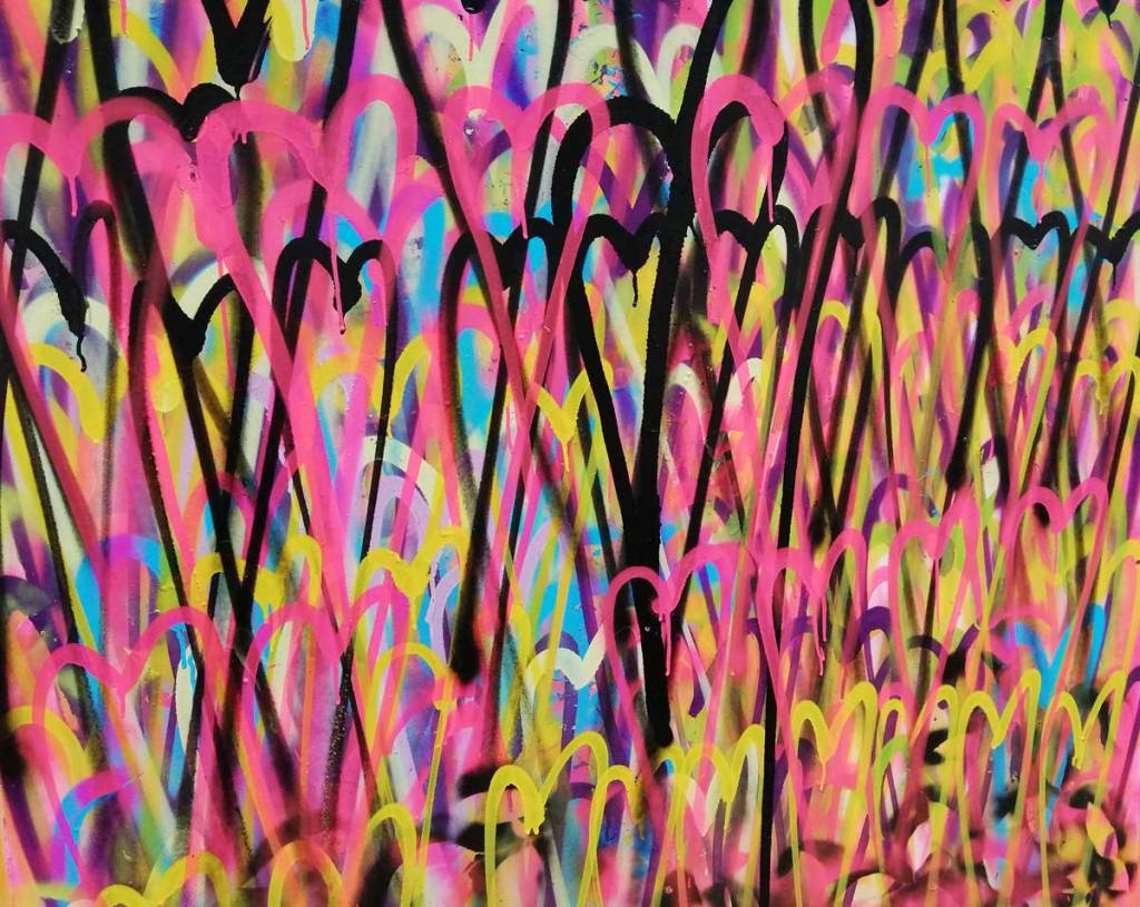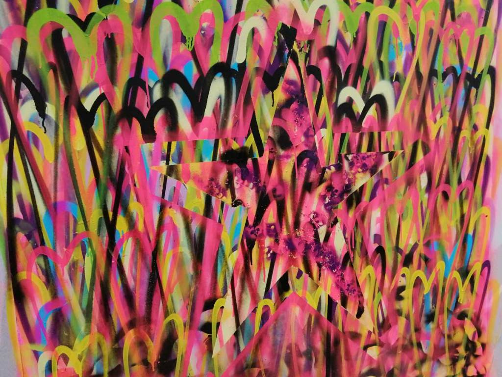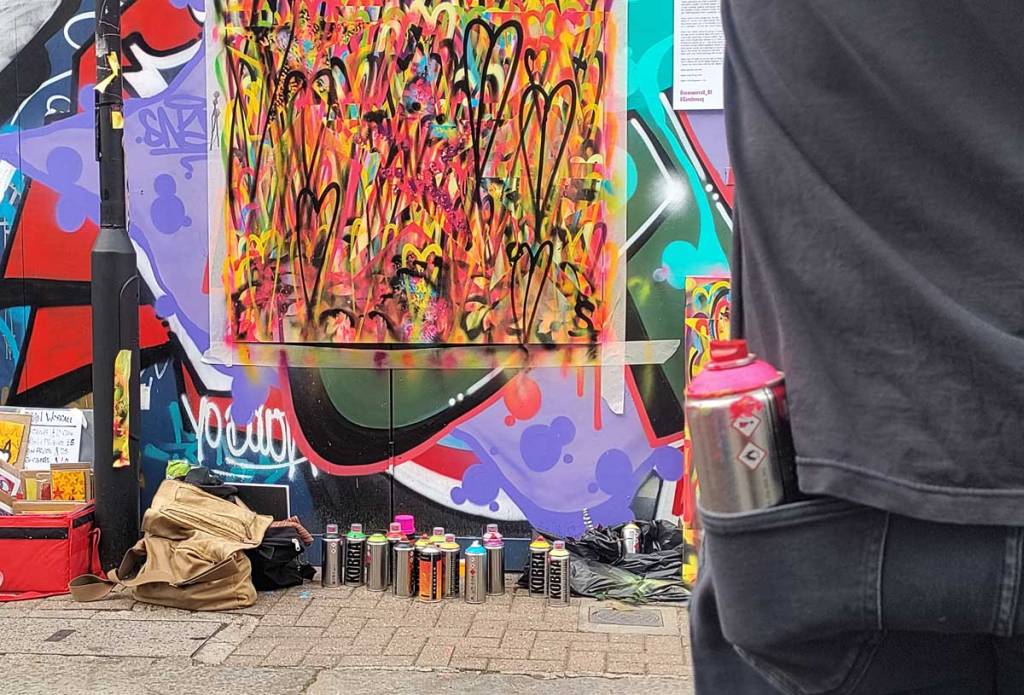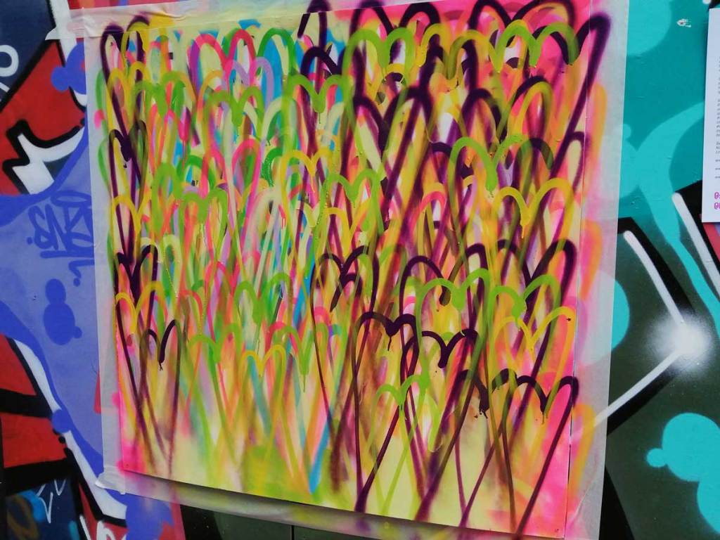 Six and a bit hours, spray can in hand most of the time, hard work! Can’t tell you that much about the bands that played, they were round the corner, I was up against the wall painting for most of the time, or getting asked questions or being photographed. That’s the thing about painting live at these festival situations, barriers come down, people feel comfortable enough to talk, to ask questions, to offer opinion, I like it, I like the interaction, I like the demands of it all, it is almost like a performance (almost, not quite), sometimes art really needs to reach out more than it does, I like doing things like this. I’m not saying art should dumb down, I imagine I love a white walled gallery more than most but art does have to reach out and engage a lot more than it does. Next week we’re off to Finchley and an installation piece on an Art Trail…