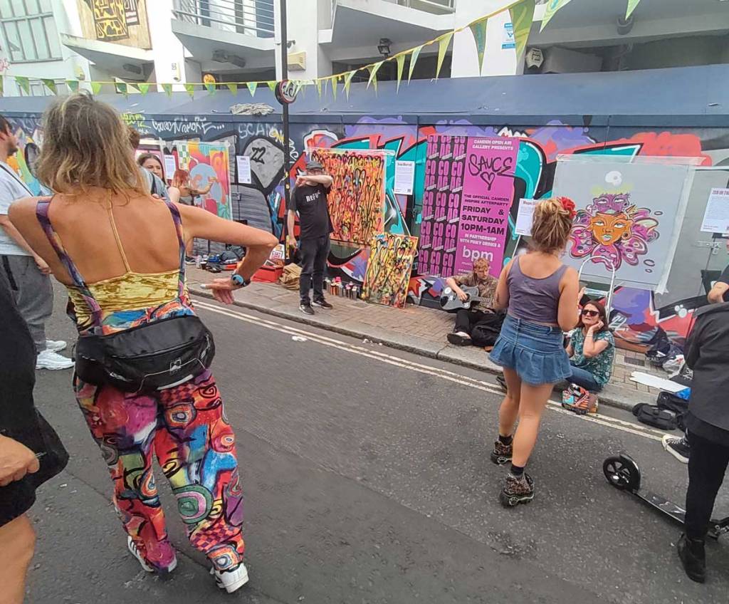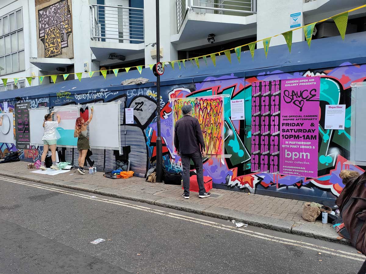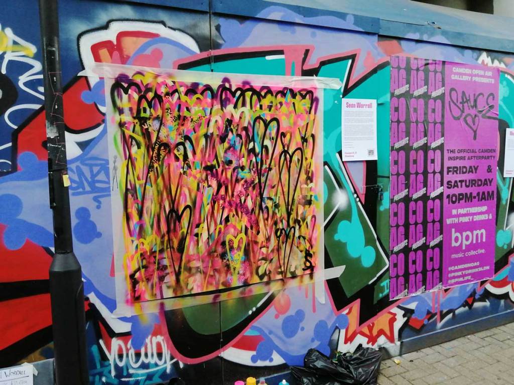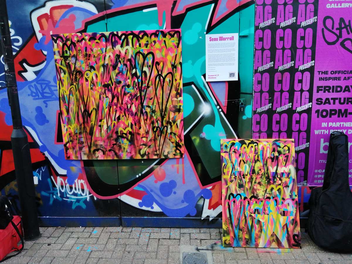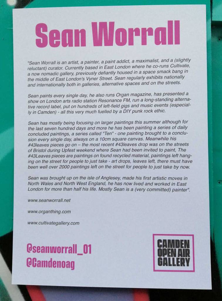 So day two of Camden Inspire happened last Saturday, a two day festival of art and music in that North London borough. I was one of ten artists invited to paint out on the street on the second day. There’s a whole piece written about the day, quite a few words and lots of photos of other people’s work up on the Organ website – Two days of street art, music and more, did Camden inspire? – I’m just going to leave some photos of my piece painted on the day here on this page. Well two pieces actually, I finished ny actual piece way too early in the day, had to go buy a canvas and paint a second piece.