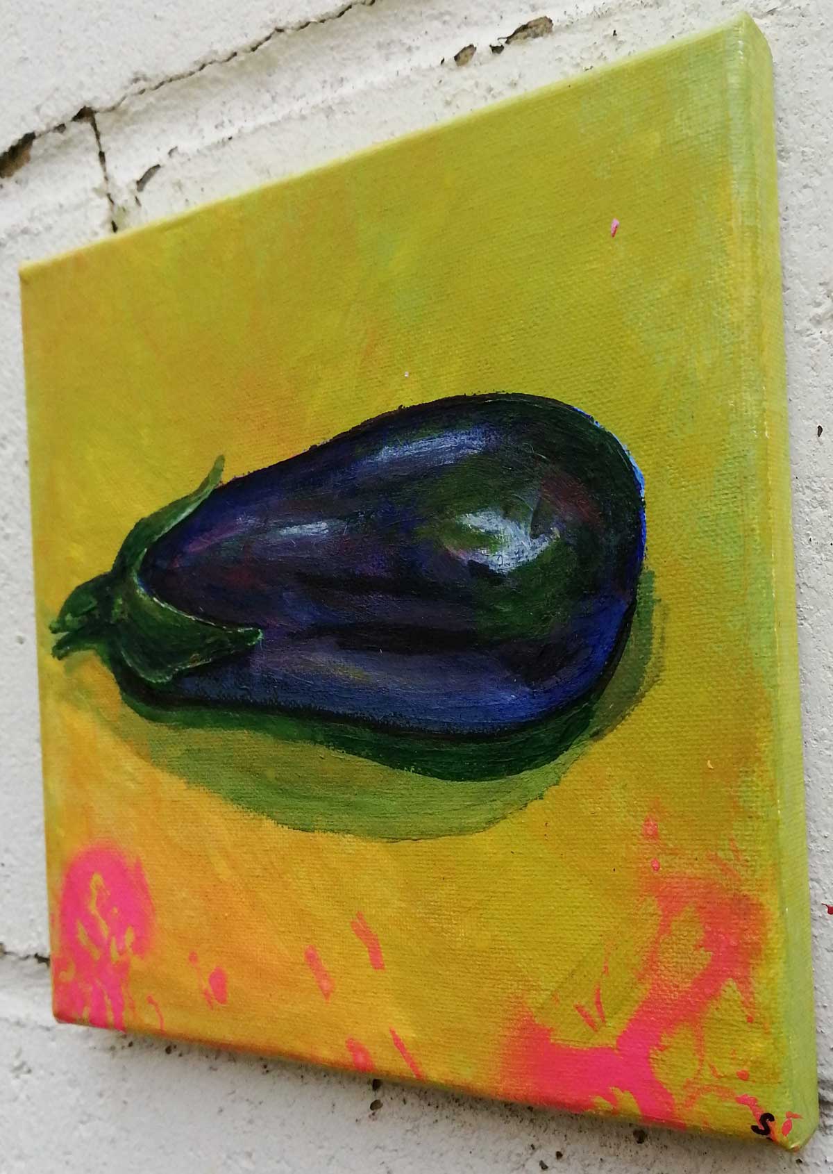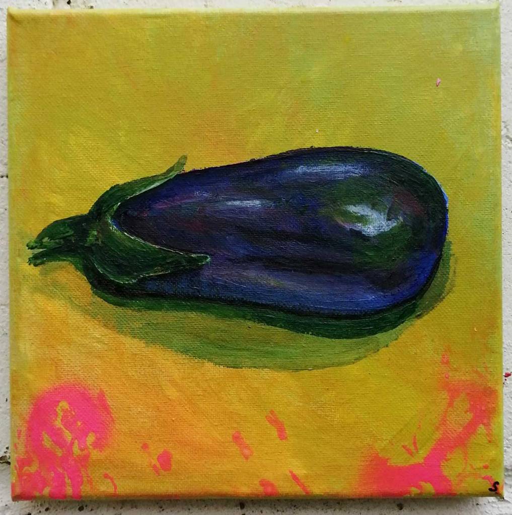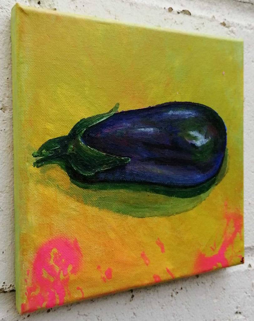 As I’ve said many times already, probably too many times now, the whole fruit (and veg) thing started in early 2019 when a friendly market trader at the still beautifully ungentrified Ridley Road Market over in Dalston, on the edges of Hackney, here in East London, threw a lemon at me and shouted (in a rich West Indian flavoured London accent), “hey painter man, paint a Lemon”. And so the Lemon from Ridley Road Lemon was painted an a series of paintings was born that evolved into a market stall of fruit and veg paintings, a show called “Fruit Shop” in an art gallery based in an old East London Greengrocers shop. The series of paintings has continued (I do like a series) and here we are late in 2022, not painting so many pieces of fruit but yes, still doing it, still including pomegranates or freshly fallen apples in bigger paintings, still finding it hard to resist an aubergine or an orange. There’s just something very enjoyable about painting fruit (and yes, technically aubergine is a fruit), there will still, now and again, be fresh fruit and veg….