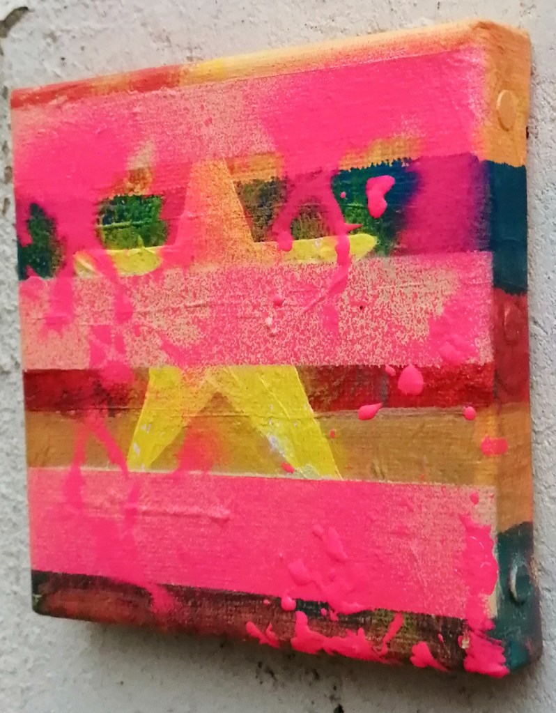 A still ongoing series of daily concluded paintings, a painting finished every single day, not started and finsihed, just one a day concluded. There are always a number of pieces in progress at any given time here in the studio. Always on a 10cm x 10cm x 1cm canvas. The daily series started back in July 2020, who knows how long it will go on for? Always on a 10cm square canvas, always offered for sale at a price of £10, always Ten. The Ten paintings are generally available via the Cultivate shop but please do ask, always good to ask. Everything that is still for sale is either in the shop or not marked “sold” here or here, send a message if you want one that isn’t in the shop.