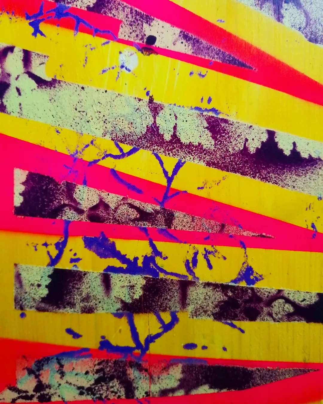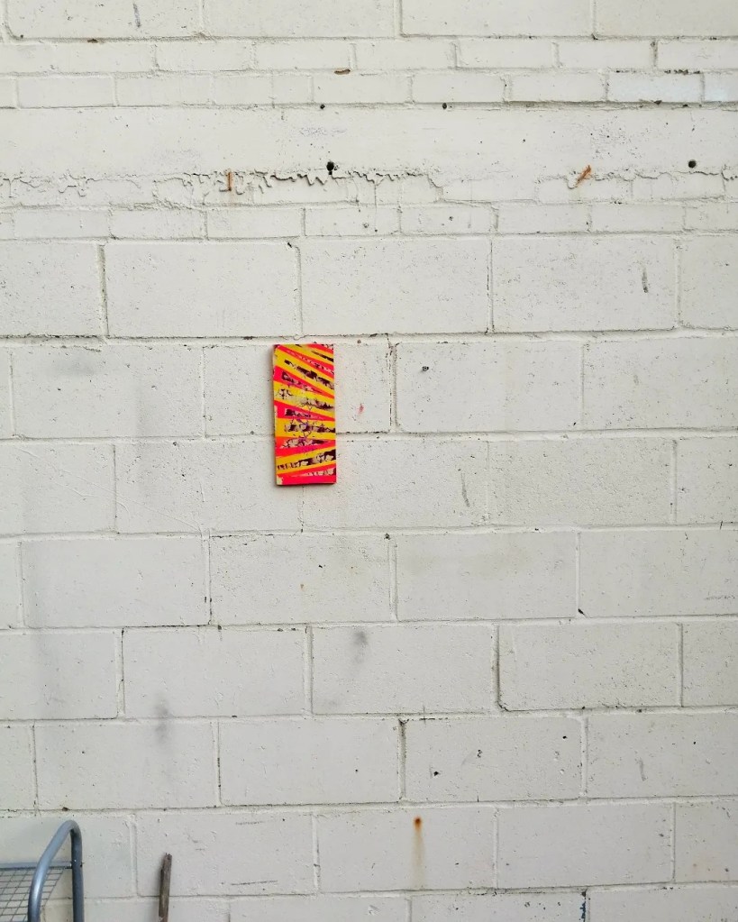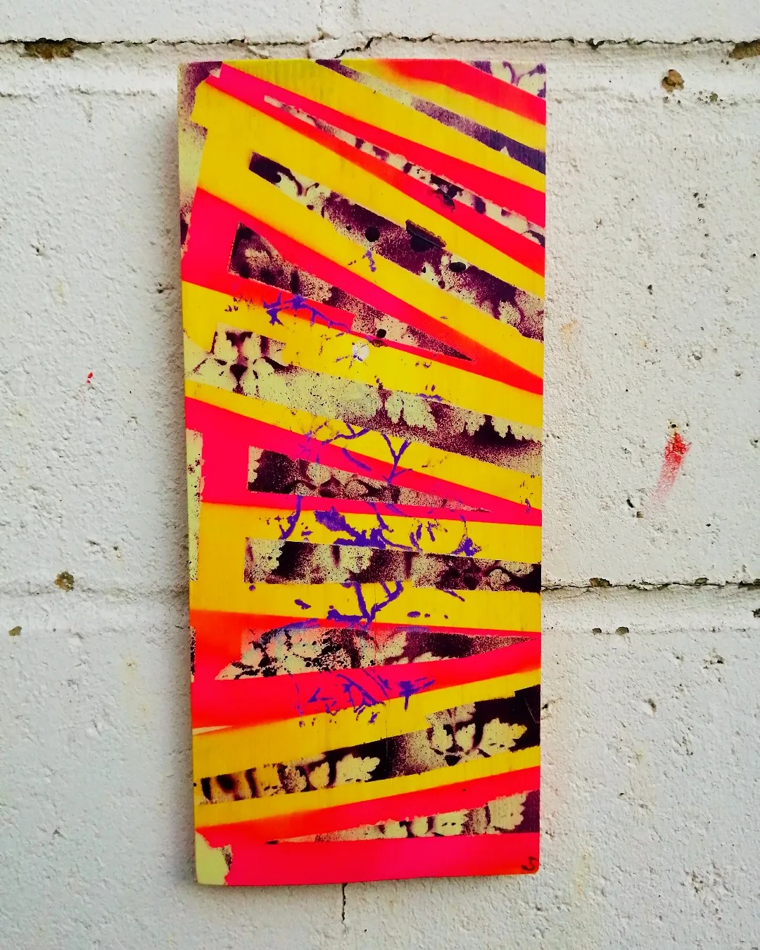 “More or Less” (Jan 2023) – Acrylic, spray paint, screen printing, gloss varnish on found recycled wood, 14 x 32 x 1.8cm – :If a piece of wood is thrown out then leaves are going to grow on that piece of wood.. I imagine this one will be in the Cultivate shop later… yes, indeed it is
