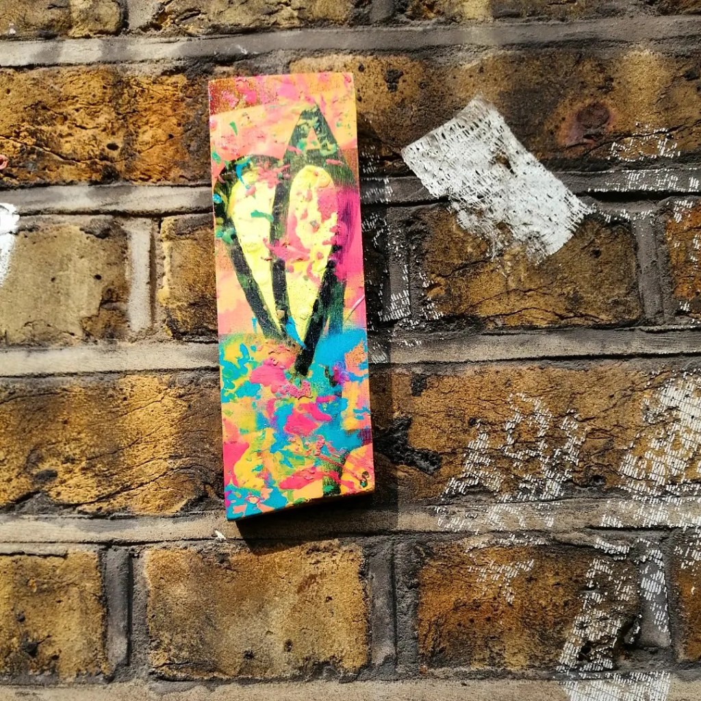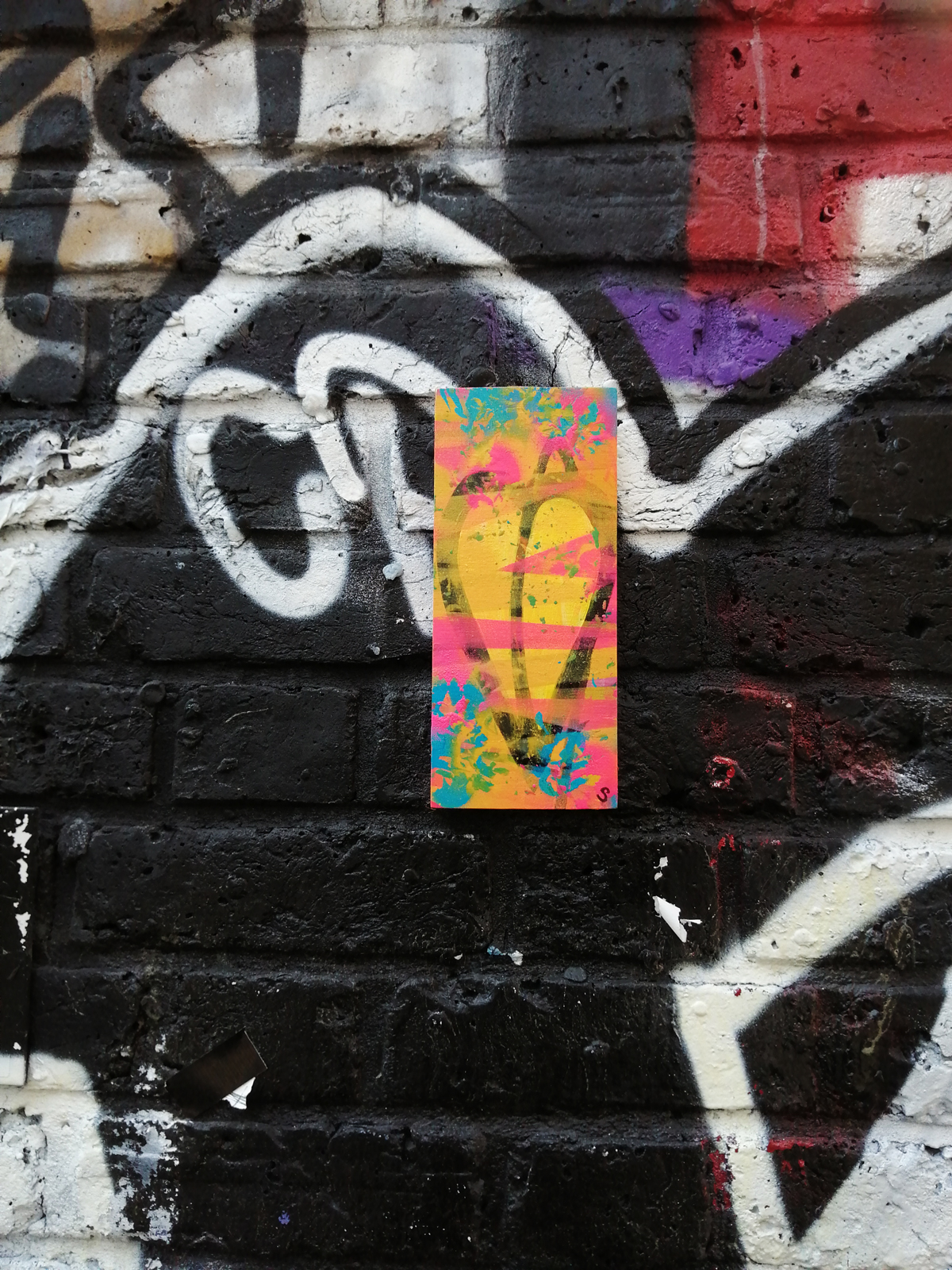 The April #43Leaves piece, well part 27 to 29 of the month-long drop. The art drops, or the #43Leaves piece have been going on all year, a piece left here, another there, lot’s more about it all here. April saw a more formal piece in 43 parts, 43 paintings, left hanging on the streets during the month of April. I do keep repeating that the recycled aspect is a very important part of all this. The leaves, for they are leaves, whatever you might see, I paint leaves (if you wish to see something else that’s fine, there is no right or wrong). The paintings are always on found unwanted material picked up off the streets, out of builders skips, left on pavements, things that were heading for landfill, things considered of no use any more. Material found, cleaned up, painted on, and then left hanging back out there for people to just take should they wish to.