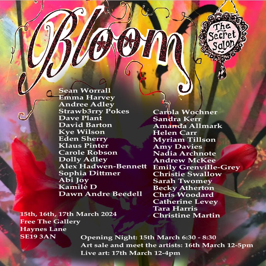 The Secret Salon presents Bloom – 15th to 17th March. Opening night Friday 15th 6.30pm and then open Saturday and Sunday 16th/17th March Midday to 5pm on Saturday, to 4pm Sunday at Free the Gallery, Haynes Lane, Crystal Police, London SE19 3AN