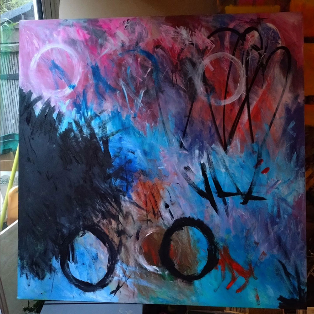 Today at the studio, work in progress, painting while I still can’t really see. This afternoon was mostly just about covering this larger canvas. The beast is 120x120x4cm and I just wanted to cover it, tame it, get control of it and loosely explore colour and texture. These are detail shots, areas and once again I need to take photos and look at them to get more idea in terms of what is emerging. My one still working eye is settling down after last week’s operation and so far so good although I won’t really know until next week and the first check up.