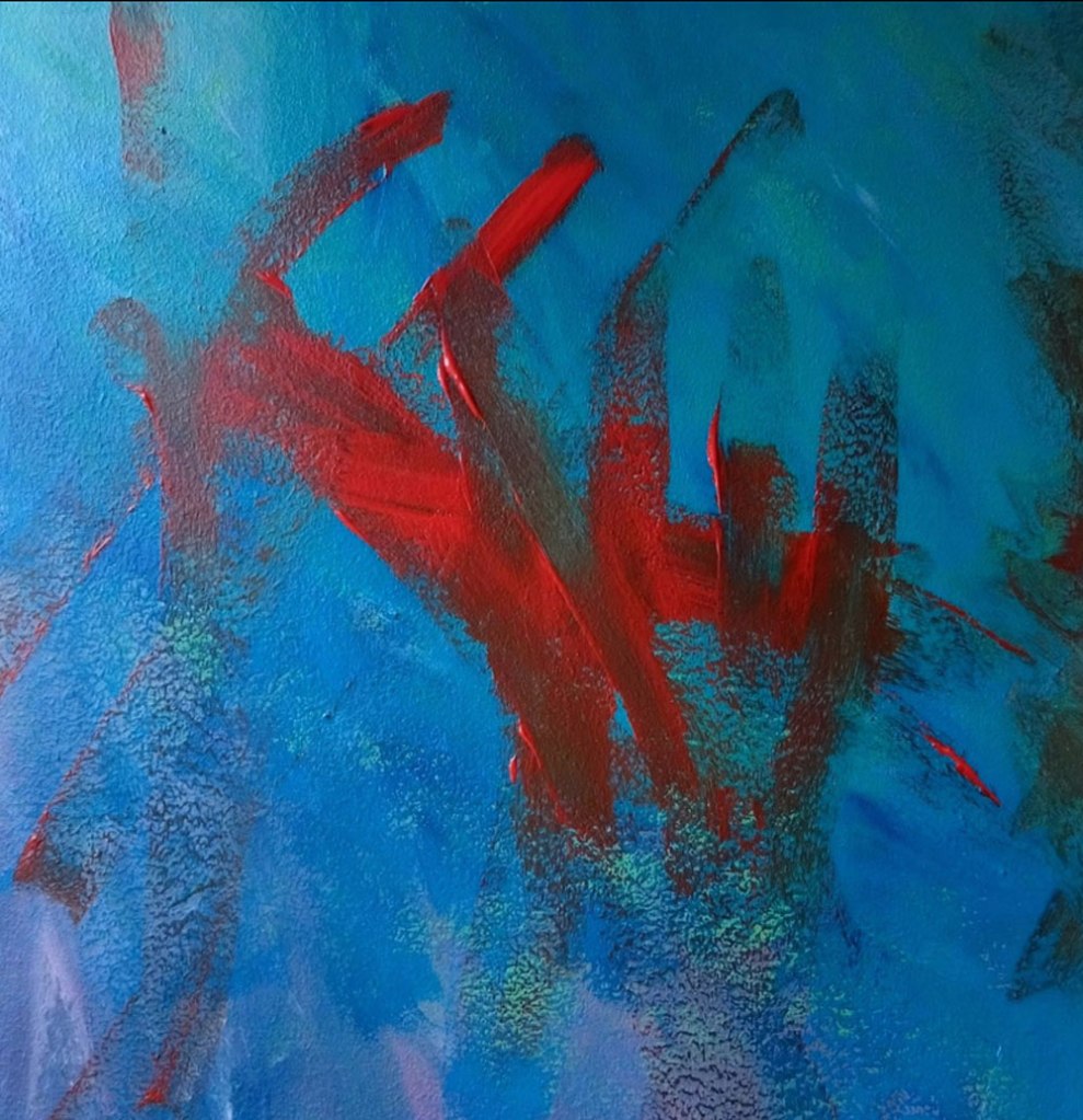 Today at the studio, work in progress, painting while I still can’t really see. This afternoon was mostly just about covering this larger canvas. The beast is 120x120x4cm and I just wanted to cover it, tame it, get control of it and loosely explore colour and texture. These are detail shots, areas and once again I need to take photos and look at them to get more idea in terms of what is emerging. My one still working eye is settling down after last week’s operation and so far so good although I won’t really know until next week and the first check up. More about under the next image…