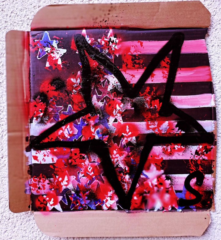 The Stripes series probably wasn’t really thought of as a series of paintings back at the start of it all, it was just an untitled painting, subtitled Stripes, and then there was a second one and a then a third and there is a pleasure in just painting stripes, enjoying the paint, the pleasure of colour, the process, the movement of a loaded brush. And then somewhere around 2020 one of those Stripes paintings went red blue and white, probably something to do with the frustration in terms of watching what was going on with the so called leader of the free world, that and pop art and the everything the Stars and Stripes means in terms of pop art and the world order and for someone who was born in the 60s, landing on the moon and what the hell can I do over here in my East London bunker? Painting while watching American politics and marches on Washington and the trials and the relief more than the hope of Biden’s win in late 2020 and the horror that isn’t so much the horror of Trump and the things he says as it is Trump’s followers and the unbelievably insane things they say, their blind devotion as he so obviously manipulates and then laughs at them and just doesn’t go away. All we can do from over here is watch, squirm. The flag is a strong image, a pop art thing, the rock ‘n roll dream, Hendrix at Woodstock, the MC5, the New York Dolls (or were they more hammer and sickle?). And then he was found guilty and then he was shot and still all we can do over here is watch and I did finally attempt to gather all the Stripes paintings together on one page, the series (as it is now), started somewhere in 2020, see (nearly) all of them here