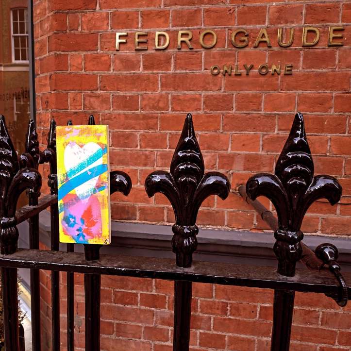Meanwhile the leaving of leaves goes on, the #43Leaves pieces. As always painted on found unwanted recycled material picked up off the street, picked up, cleaned up, painted on and then left hanging back out there on the street for someone to just take should they wish to… The 51st of the year was left hanging on a West End railing last Thursday. Always painted on found material, that is a very very important part of it, there has probably been more like three thousand than two thousand leaves left now, this year the intention is to leave 365 leaves… Follow the #43Leaves leaves via my Instagram thing, there’s never enough time to stop and document them all here, although I am attempting to film each leaf left this year