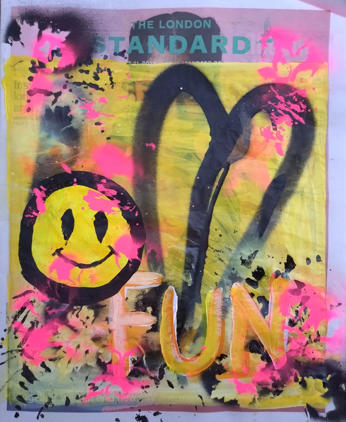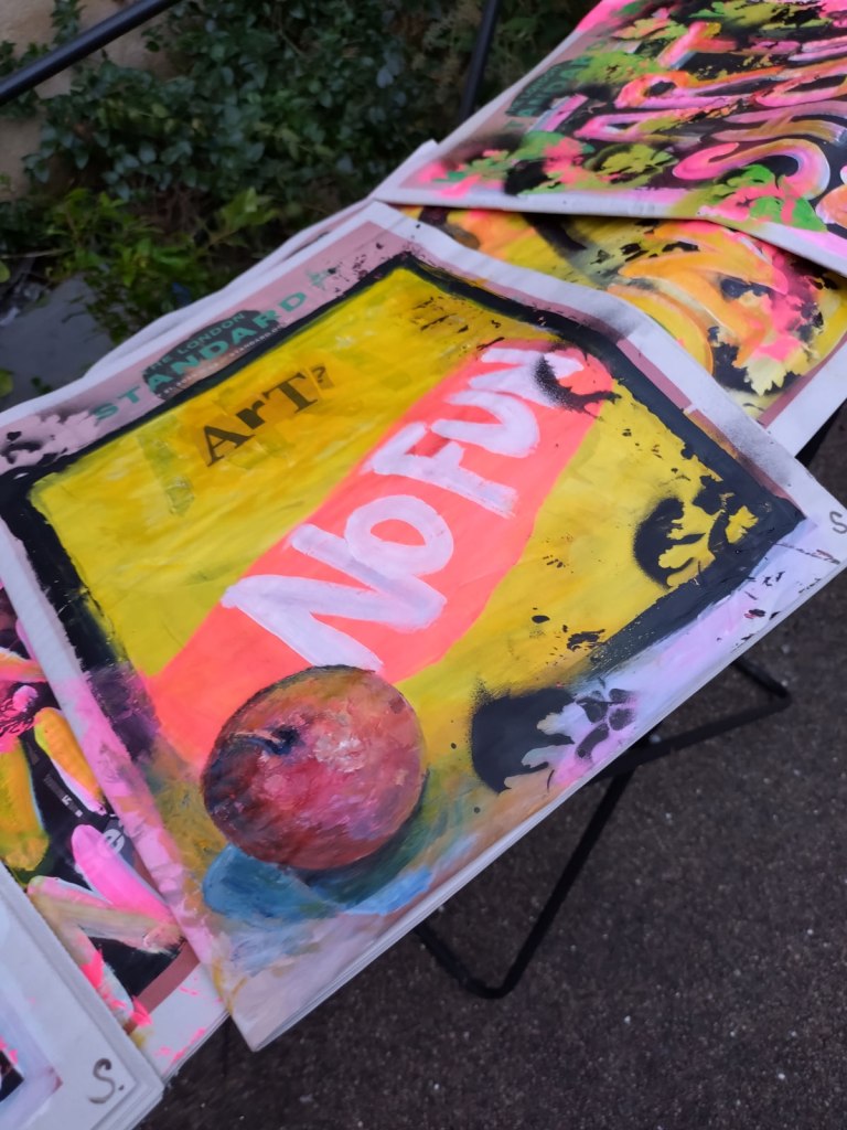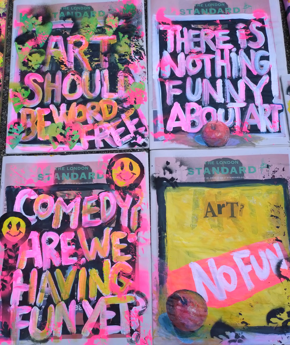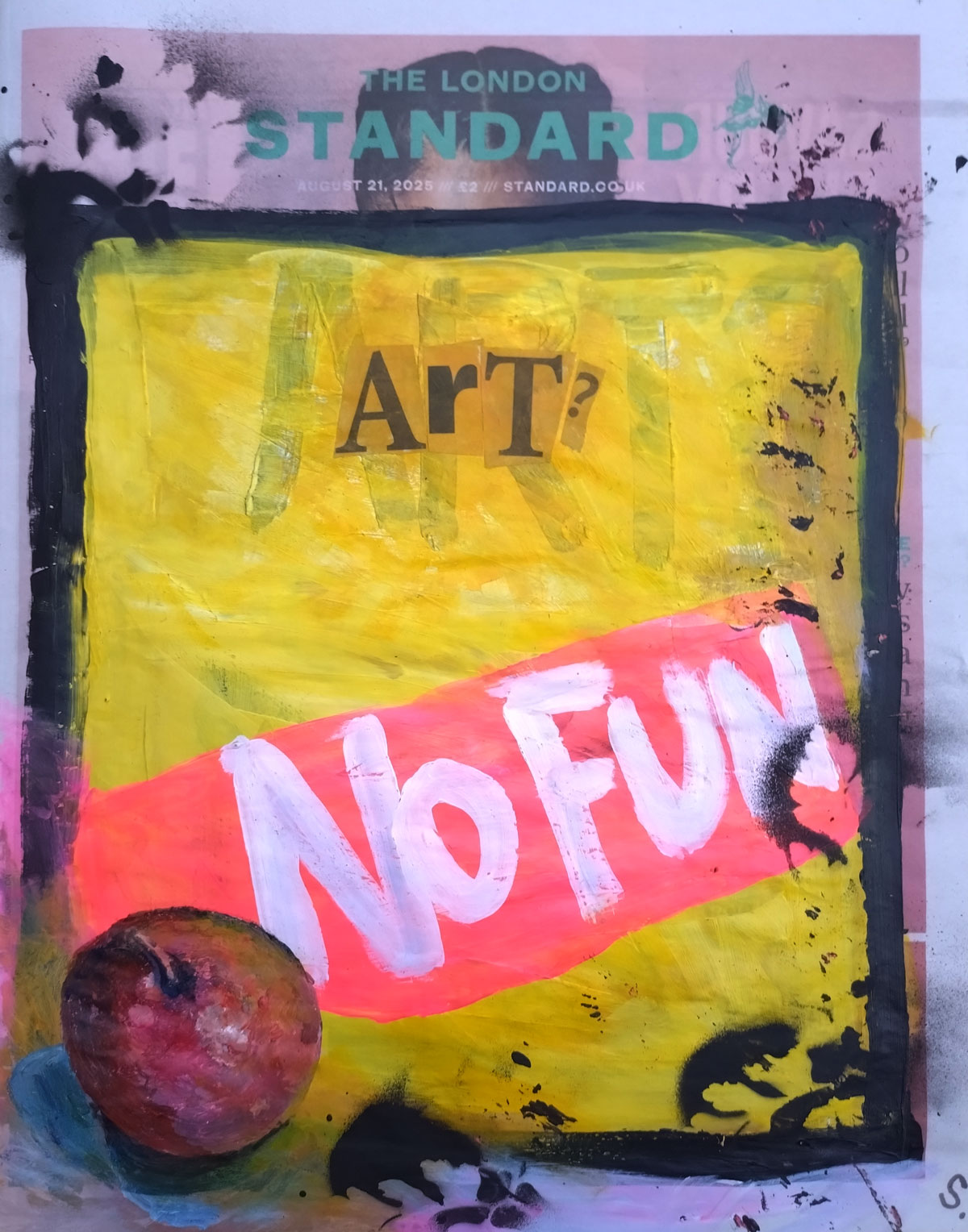 We are less than a week away from this year’s Art Car Boot Fair at Kings Cross, this year’s theme is Comedy and the Comic, I don’t really do comedy, there’s nothing funny about art, and frankly, with all that going on right now in Gaza and Trump and so many other thing, I’m not laughing much these days. I did paint a couple of apples on old newspapers and Iam kind of repeating myself here (both with the apples and these words)