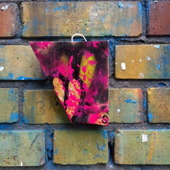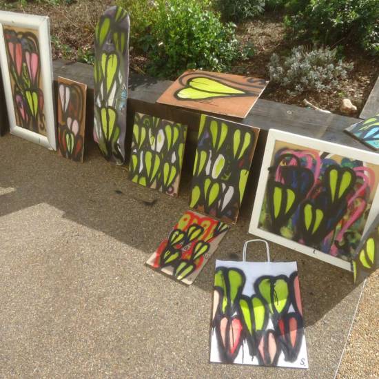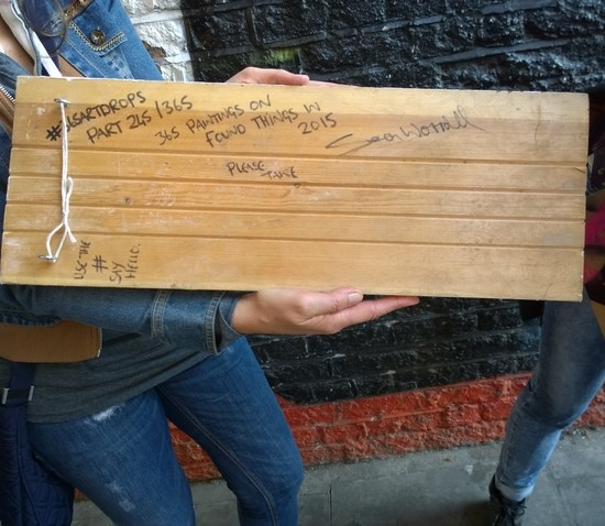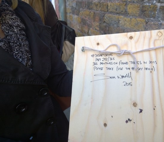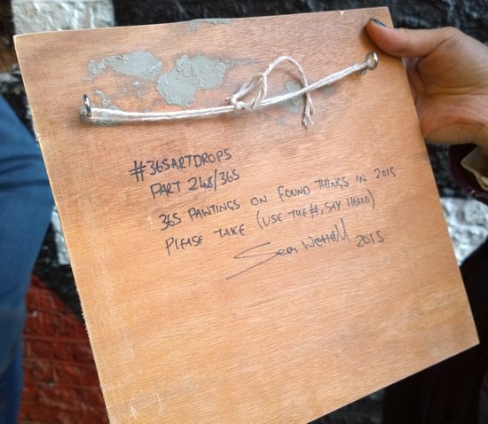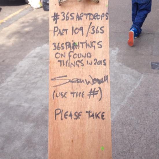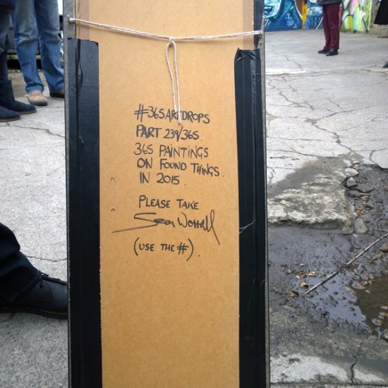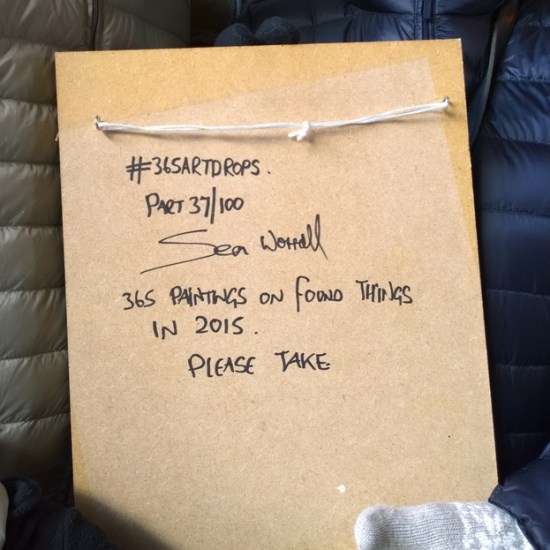 The idea of the #365ArtDrops piece, one year-long piece of work in 365 parts came together spontaneously on the first day of 2015, there was some cardboard in the studio that had just been picked up off the street, there’s always things in the studio that had been picked up off the street to paint on, old canvases people had thrown out, doors, pieces of wood, frames, vinyl, there’s always something to paint on. And so without any kind of planning, the idea of a painting on something picked up off the street, a painting on something unwanted, a painting put back out on the street, 365 paintings put back out on the street for people to take should they wish to do so.