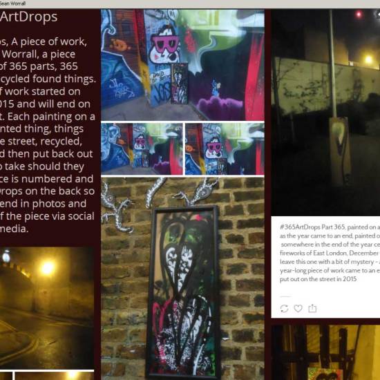 We have no idea what happened to all of the paintings, I imagine some of them did end up in landfill anyway, we do know the fate of some of the 265 parts of the piece, we do know that pieces ended up in Chicago, in San Francisco, in Los Angeles, San Diego, in Argentina, Canada, in Australia, Ireland, Israel, Wales, Germany, Sweden, Spain and all over England. We heard about pieces travelling to Newcastle, being taken to Bristol, ending up in Birmingham, in Oxford, Brighton, we found photos of people with their pieces posted on social media with the hashtag attached, people sent in photos, people sent in brilliant stories, tales, sometimes very moving tales, a couple of pieces turned up in art galleries, one or two were spotted for sale on internet auction sites, or re-hung in places we didn’t leave them in. The piece of went on all through 2015, the final painting was left out just before midnight on December 31st, we hadn’t seen a hashtag used like that before, although quite a few artists have taken up the idea since and indeed the idea has been build up on here with several #43ArtDrop pieces and such in 2016 and 2017. It was about a lot more than just leaving free art for people (and it certainly wasn’t, as some had suggested), a publicity stunt, it was about many things on many levels, it was about whatever you wanted it to be about it was a big part of my 2015, I hope you enjoyed it and if you took part then thank you very much. (sw)