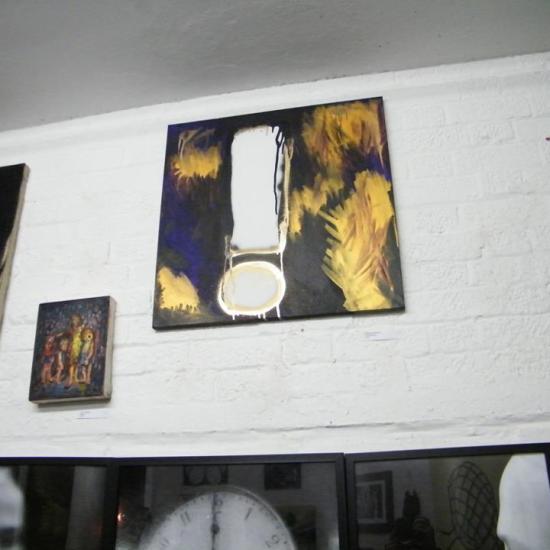 31st Jan – Last night’s exclamation on a 50cm x 50cm on a dirty white canvas left outside the studio, painted last night, on the gallery wall today – gold, violet and black acrylic and just a drop of Montana dripped on to it