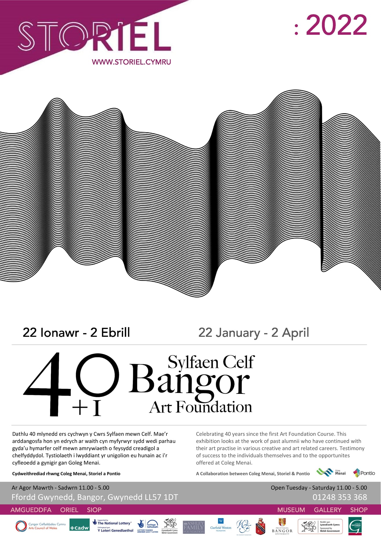 Sylfaen Celf Bangor Art Foundation 40+1 – Storiel Gallery, Bangor (Wales) – January 22nd – April 2nd 2022 – A group show celebrating 40 years of the highly respected Art Foundation Course and featuring around 40 ex students of all disciplines from the last 40 years. More details soon. STORIEL, Ffordd Gwynedd, Bangor, Gwynedd,.Wales, LL57 1DT. Due to current covid restrictions, there is no opening night, we’re told a late evening opening in set for 4th March, and indeed there now is . There’s a piece about the show here