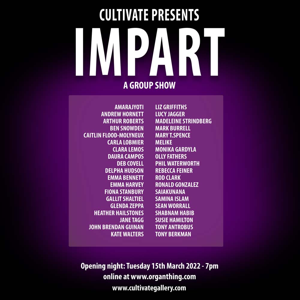 Cultivate presents Impart – opening night Tuesday March 15th 2022, view the show here – Another on-line group show curated by Cultivate founders Emma Harvey and Sean Worrall, the show will once again be hosted on the Organ website, it kind of looks like we’re repeating the run of monthly on-line shows like we did during the first half of 2021.