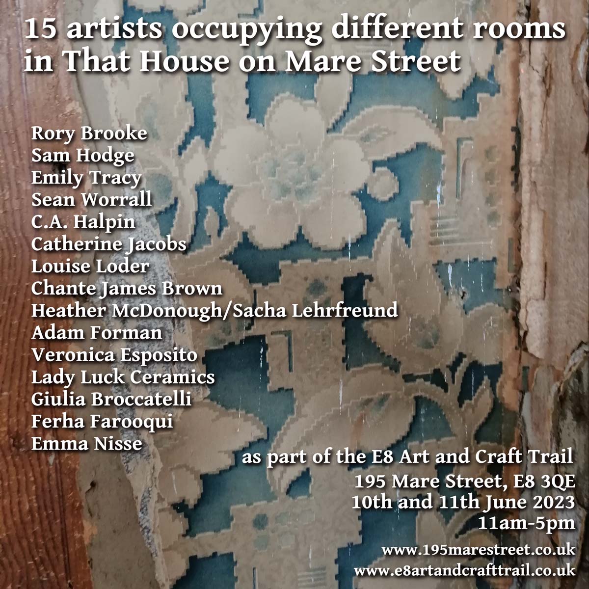 That House on Mare Street – 15 Artists occupying rooms in the Georgian building and possibly the second oldest house in Hackney (1697) as part of the E8 Art Trail – Happening over the weekend of 10th and 11th June 2023, a Hackney Art and craft Trail where artists open their studios for a weekend while other Hackney artists gather with stalls and installations of work in the rooms atat 195 Mare Street (which is where you will find me on both days from 11am until 5pm). 195, “once the New Lansdowne Club/Elizabeth Fry Refuge. Now offering refuge to local artists while awaiting restoration as family home and arts space”. More details of the trail and the event at 195 Mare Street here via an Organ preview. That House on Mare Street really is something to see before the restoration kicks in, worlth coming along at the weekend jst to see it as it is now.