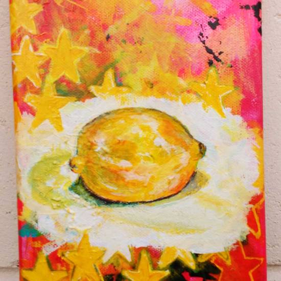 The Ridley Road Lemon (No.3)” – acrylic on canvas, Jan 2019:(15 x 20cm).