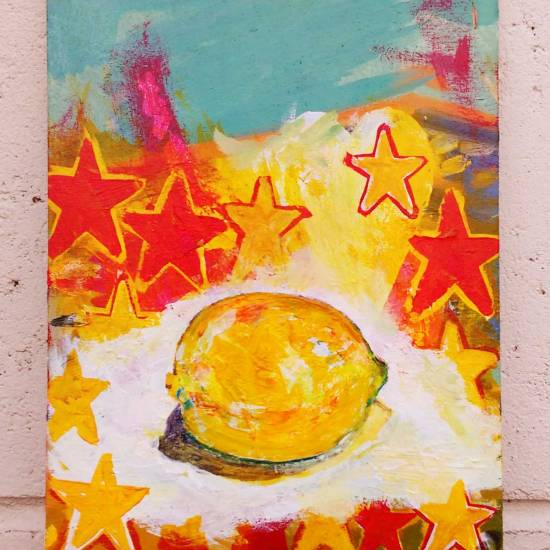 The Ridley Road Lemon (No.4)” – acrylic on wooden board, Jan 2019:(15 x 20cm).