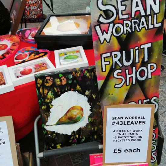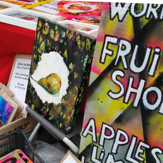It all started in January 2019 with “The Ridley Road Lemon”, at the time I said it was “a short series of studies. I do love Ridley Road Market, one of the best things about doing shows at BSMT Space over in Dalston is having to walk through the market a couple of times every day. I bought a bag of about 50 bananas for a pound last week and yer man on the stall said “here painter man, have a lemon to paint”. Said lemon had been demanding I paint it all week, there’s a pleasure in trying to paint a lemon quickly, these three hour-long studies were painted over the weekend, painted on pieces that were already evolving, canvases and piece of wood that were waiting for a taste of lemon. I might painting it again tonight, then again I might go buy an orange” and it went on from there. more fruit paintings and evolved in to market stalls, a Fruit Shop show and…