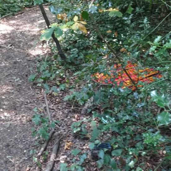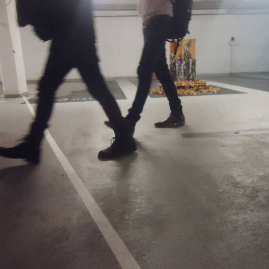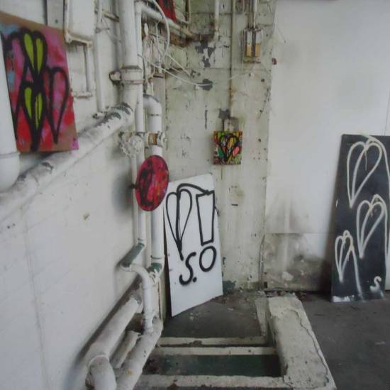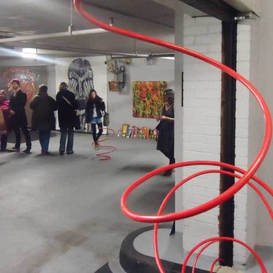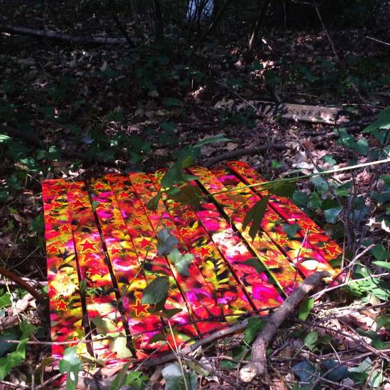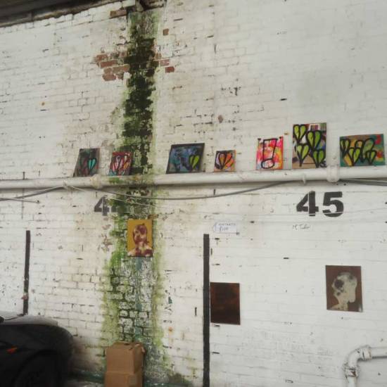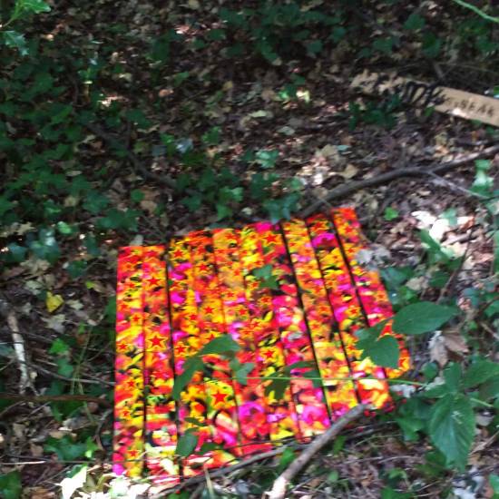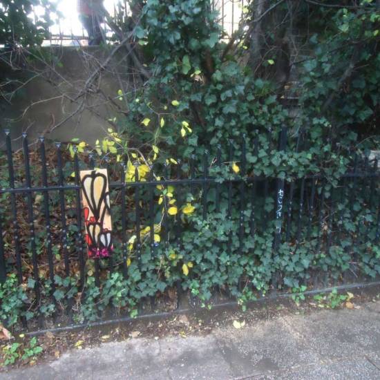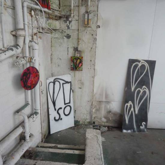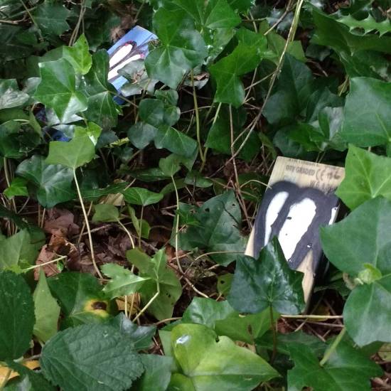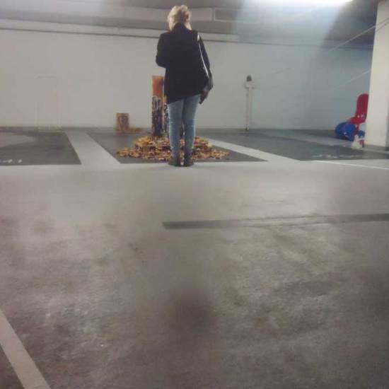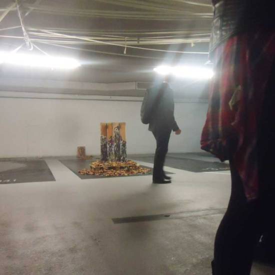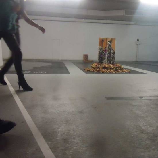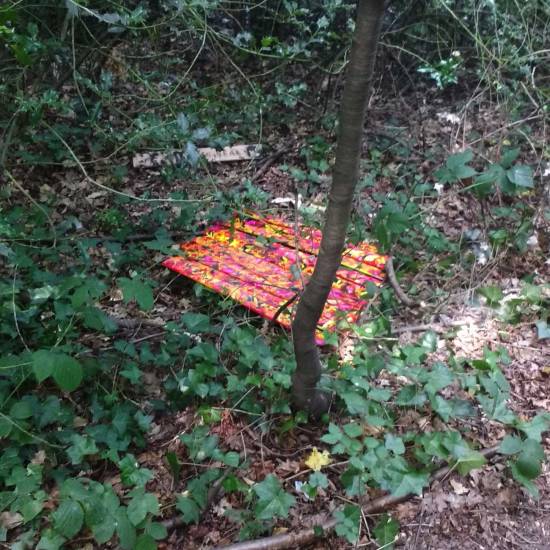 Installation: A collection or selection of images of pieces installed, or installations in brutalist West End car parks, in skips, condemned buildings in Tooting Broadway, in galleries, in East London tailors shops, hang in trees in woods in Leytonstone, in warehouses in Liverpool or Hackney, on walls in Folkestone….