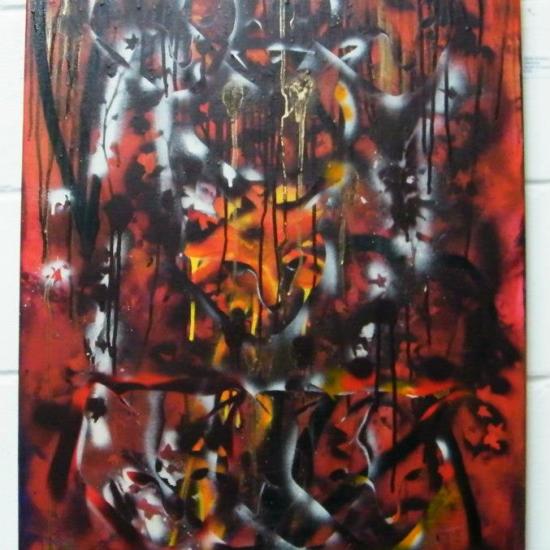 “Crimson”, April 2012, mixed media on canvas 50x40sm With added layers from Russell Reed (sold)