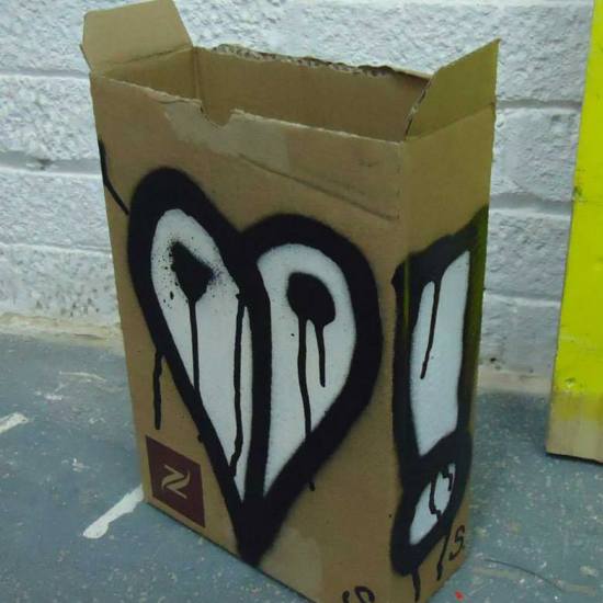 OWLS – Dec 4th 2013 – spray paint and acrylic on a found cardboard box