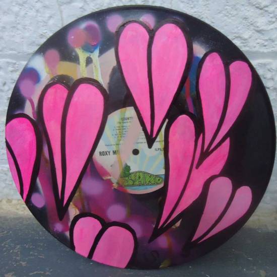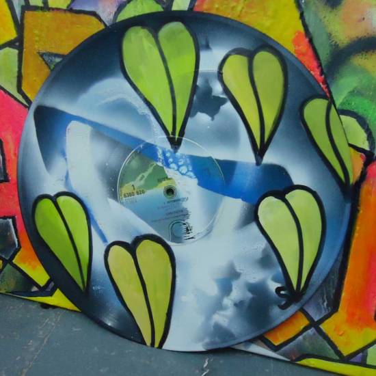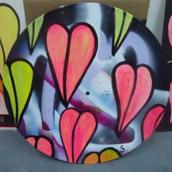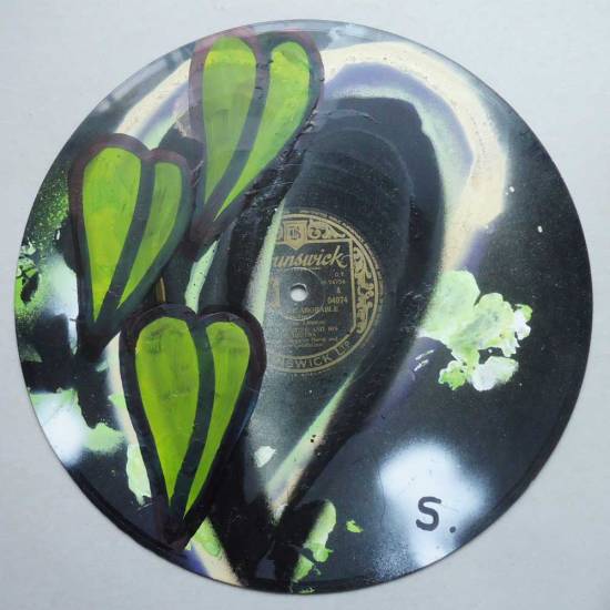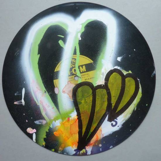 Jan 18th 2014 – New layers… Acrylic, spray paint, marker pen on a found (in the street) 7″ pink vinyl record